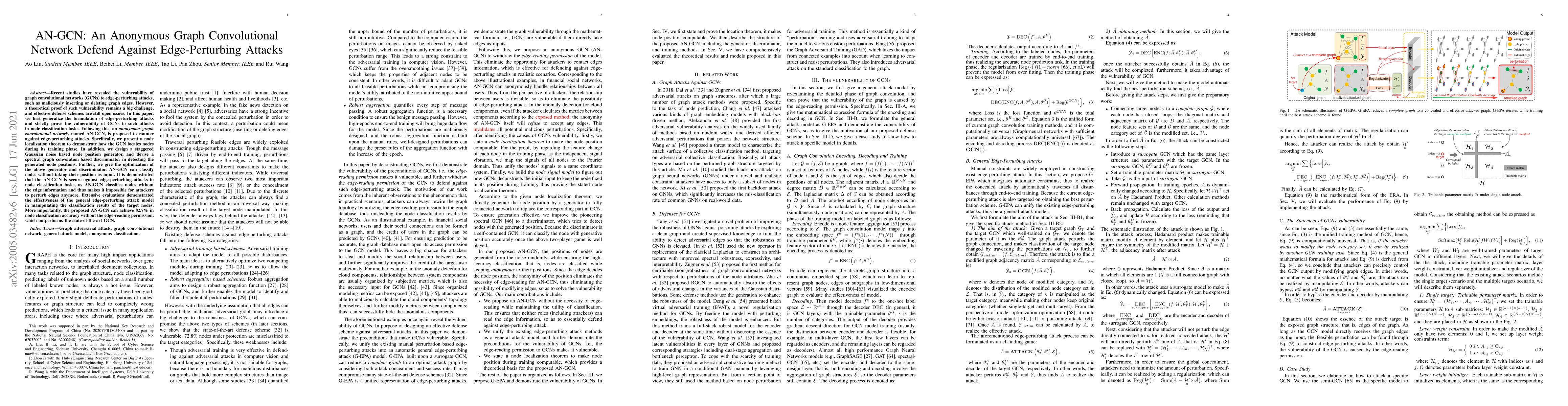 Recent studies have revealed the vulnerability of graph convolutional networks (GCNs) to edge-perturbing attacks, such as maliciously inserting or deleting graph edges. However, a theoretical proof of such vulnerability remains a big challenge, and effective defense schemes are still open issues. In this paper, we first generalize the formulation of edge-perturbing attacks and strictly prove the vulnerability of GCNs to such attacks in node classification tasks. Following this, an anonymous graph convolutional network, named AN-GCN, is proposed to counter against edge-perturbing attacks. Specifically, we present a node localization theorem to demonstrate how the GCN locates nodes during its training phase. In addition, we design a staggered Gaussian noise based node position generator, and devise a spectral graph convolution based discriminator in detecting the generated node positions. Further, we give the optimization of the above generator and discriminator. AN-GCN can classify nodes without taking their position as input. It is demonstrated that the AN-GCN is secure against edge-perturbing attacks in node classification tasks, as AN-GCN classifies nodes without the edge information and thus makes it impossible for attackers to perturb edges anymore. Extensive evaluations demonstrated the effectiveness of the general edge-perturbing attack model in manipulating the classification results of the target nodes. More importantly, the proposed AN-GCN can achieve 82.7% in node classification accuracy without the edge-reading permission, which outperforms the state-of-the-art GCN.