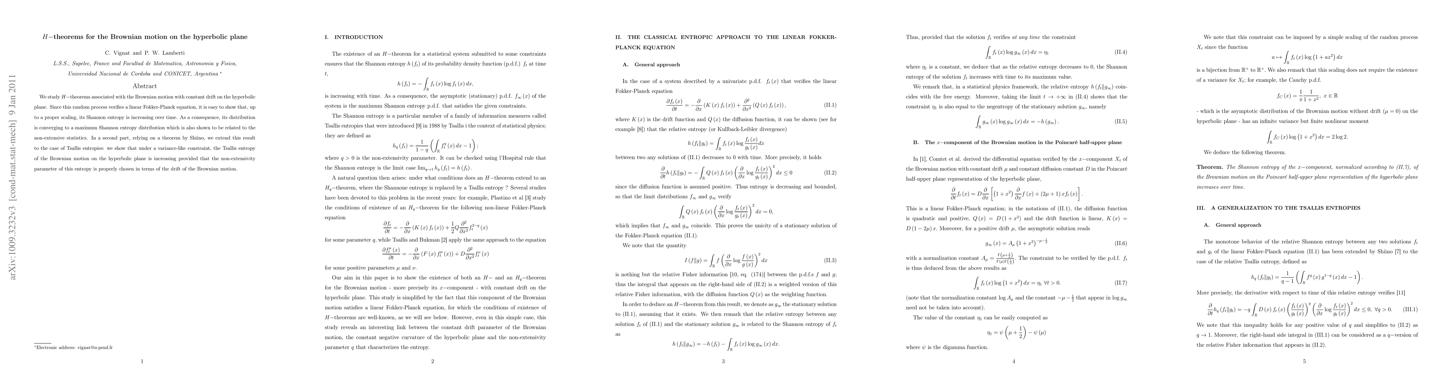 We prove an $H-$theorem for the Brownian motion on the hyperbolic plane with a drift, as studied by Comtet and Monthus; the entropy used here is not the Boltzmann entropy but the R\'enyi entropy, the parameter of which being related in a simple way to the value of the drift.