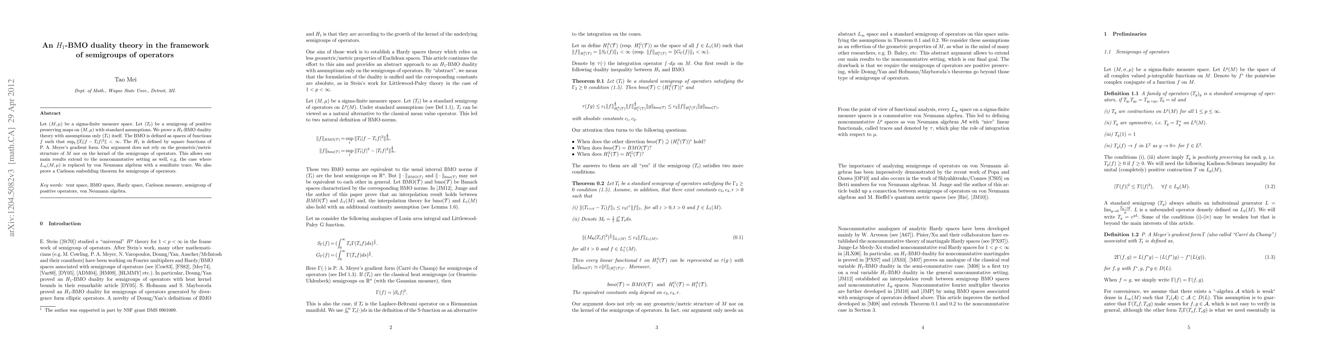Let (M,\mu) be a sigma-finite measure space. Let (T_t) be a semigroup of positive preserving maps on (M,\mu) with standard assumptions. We prove a H_1-BMO duality theory with assumptions only on T_t. The BMO is defined as spaces of functions f such that the L_\infty norm of sup_tT_t|f-T_tf|^2 is finite. The H1 is defined by square functions of P. A. Meyer's gradient form. Our argument does not rely on any geometric/metric structure of M nor on the kernel of the semigroups of operators. This abstract argument allows to extend our main results to the noncommutative setting, e.g. the case where L_\infty(M,\mu) is replaced by von Neuman algebras with a semifinite trace. We also prove a Carleson embedding theorem for semigroups of operators.