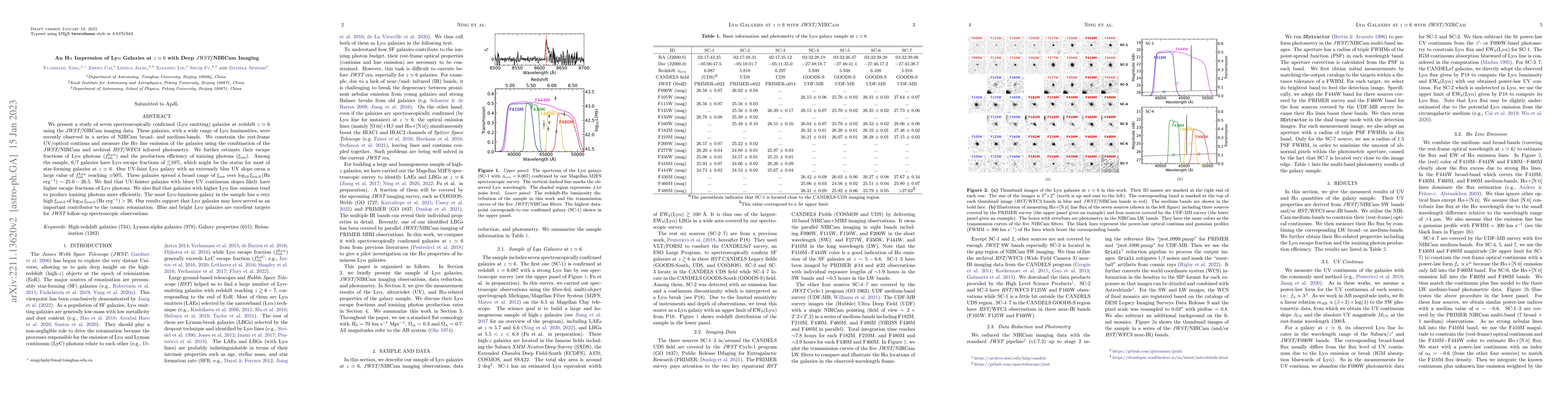 This study analyzes seven Lyα-emitting galaxies at $z\simeq6$ using JWST/NIRCam imaging, finding low Lyα escape fractions for most but one exceptionally blue UV galaxy. The research also reveals a correlation between Lyα emission and ionizing photon efficiency, suggesting Lyα galaxies' significant role in cosmic reionization.