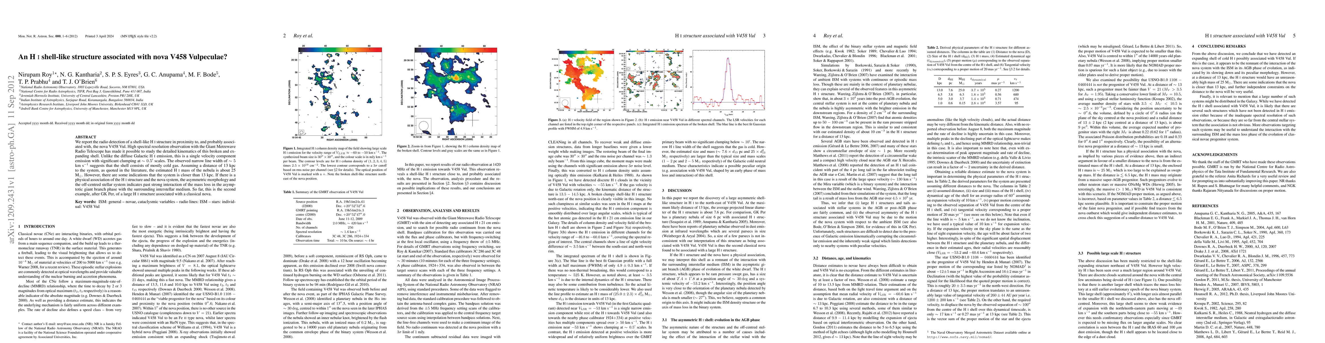 This study detected a shell-like structure of neutral hydrogen (HI) gas near the nova V458 Vulpeculae using the Giant Metrewave Radio Telescope. The structure, characterized by a single velocity component and clumping at small scales, suggests it's made of cold gas. The estimated mass is about 25 solar masses, assuming a distance of 13 kpc, though the authors propose the system might be closer. If associated, the asymmetric morphology implies past interaction between the nova's mass loss and the interstellar medium, making it the second known case of a large HI structure linked with a classical nova.