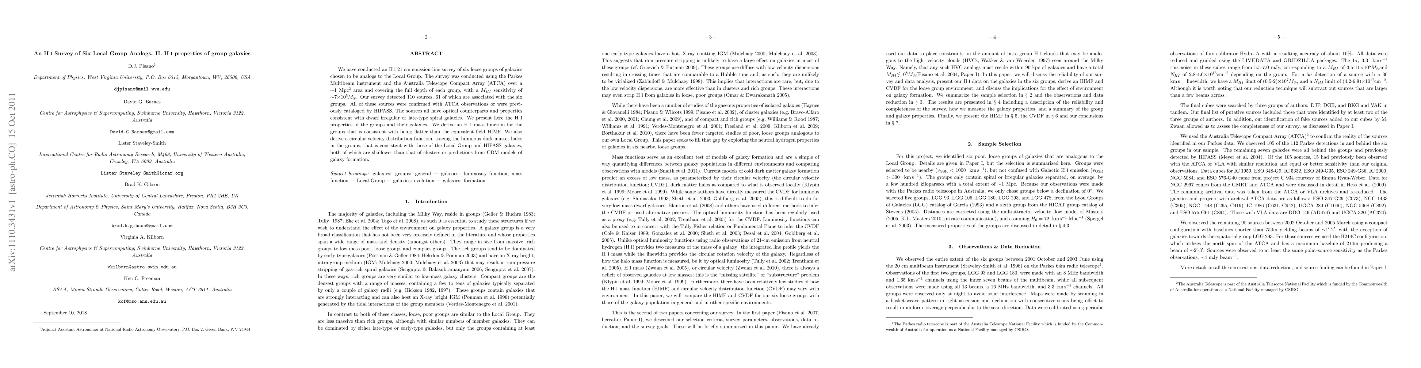 We have conducted an HI 21 cm emission-line survey of six loose groups of galaxies chosen to be analogs to the Local Group. The survey was conducted using the Parkes Multibeam instrument and the Australia Telescope Compact Array (ATCA) over a ~1 Mpc^2 area and covering the full depth of each group, with a M(HI) sensitivity of ~7x10^5 M(sun). Our survey detected 110 sources, 61 of which are associated with the six groups. All of these sources were confirmed with ATCA observations or were previously cataloged by HIPASS. The sources all have optical counterparts and properties consistent with dwarf irregular or late-type spiral galaxies. We present here the HI properties of the groups and their galaxies. We derive an HI mass function for the groups that is consistent with being flatter than the equivalent field HIMF. We also derive a circular velocity distribution function, tracing the luminous dark matter halos in the groups, that is consistent with those of the Local Group and HIPASS galaxies, both of which are shallower than that of clusters or predictions from CDM models of galaxy formation.
