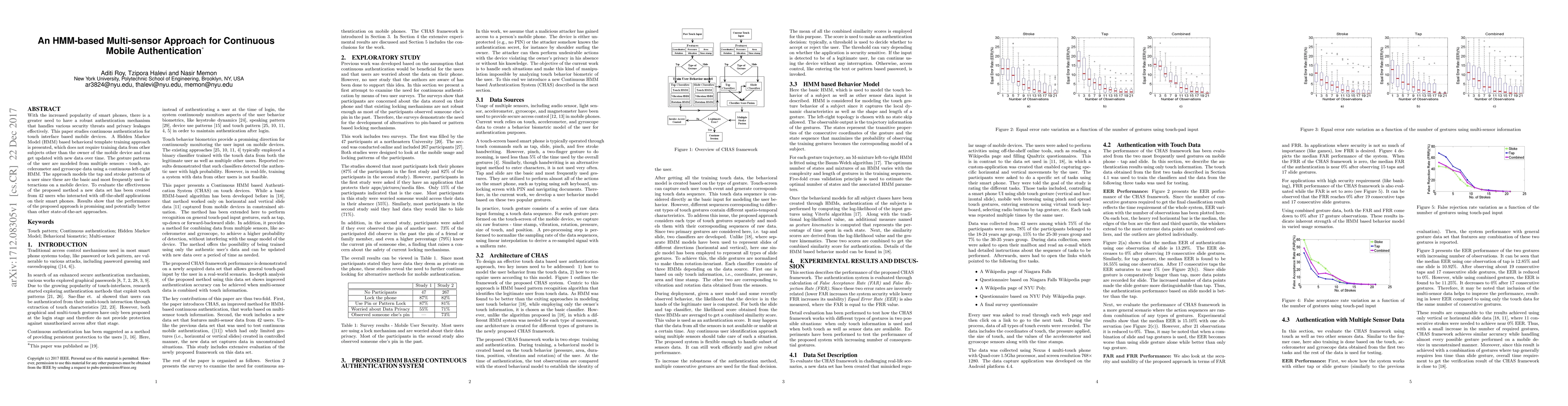 This paper proposes an HMM-based multi-sensor approach for continuous mobile authentication using touch, accelerometer, and gyroscope data. The method trains a behavioral template from the user's own interaction patterns without requiring external training data, demonstrating promising results in a new dataset from 42 users.