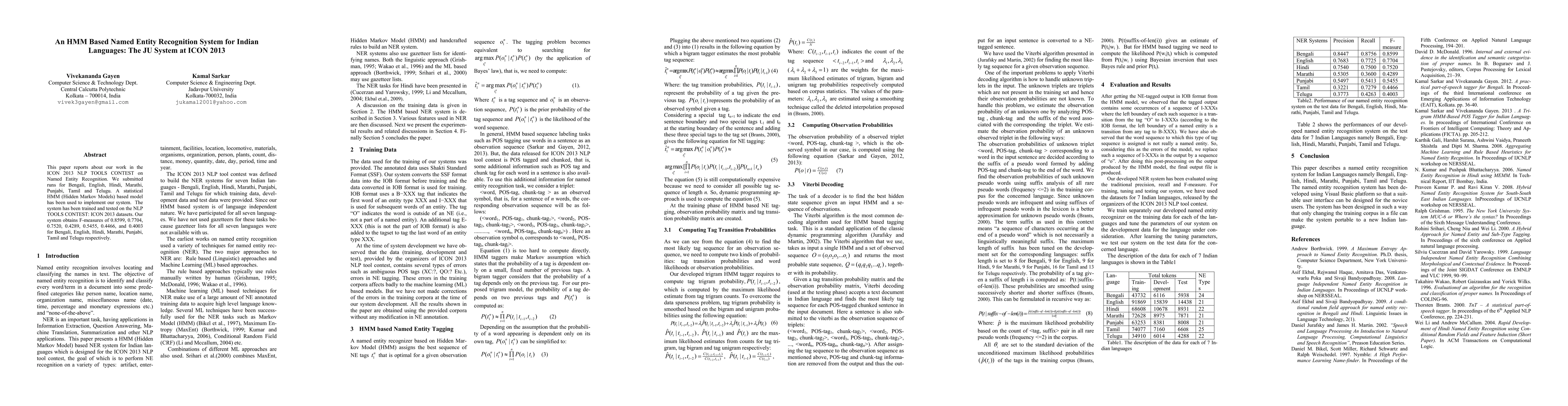 This paper reports about our work in the ICON 2013 NLP TOOLS CONTEST on Named Entity Recognition. We submitted runs for Bengali, English, Hindi, Marathi, Punjabi, Tamil and Telugu. A statistical HMM (Hidden Markov Models) based model has been used to implement our system. The system has been trained and tested on the NLP TOOLS CONTEST: ICON 2013 datasets. Our system obtains F-measures of 0.8599, 0.7704, 0.7520, 0.4289, 0.5455, 0.4466, and 0.4003 for Bengali, English, Hindi, Marathi, Punjabi, Tamil and Telugu respectively.