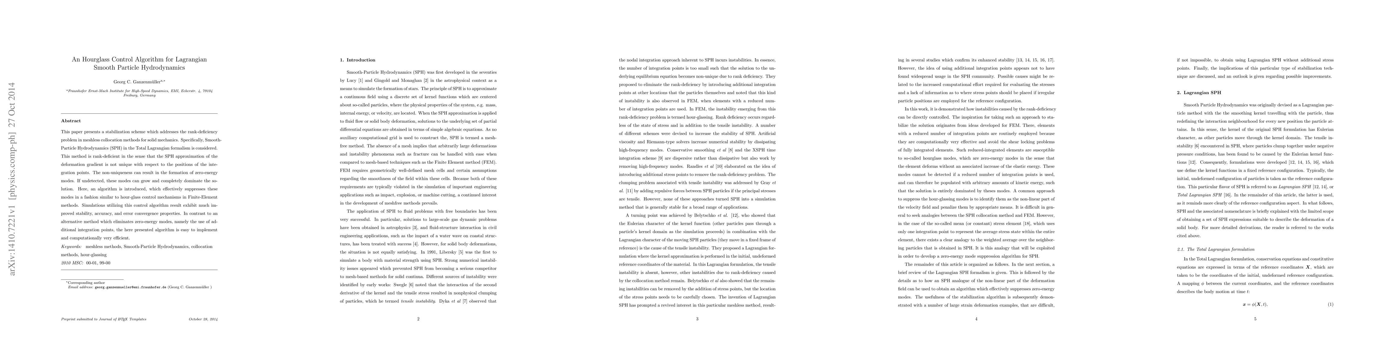 This paper introduces an hourglass control algorithm to stabilize Smooth-Particle Hydrodynamics (SPH) in the Total Lagrangian formalism, addressing the rank-deficiency issue and improving stability, accuracy, and error convergence without the need for additional integration points. The method effectively suppresses zero-energy modes, enhancing simulation results.