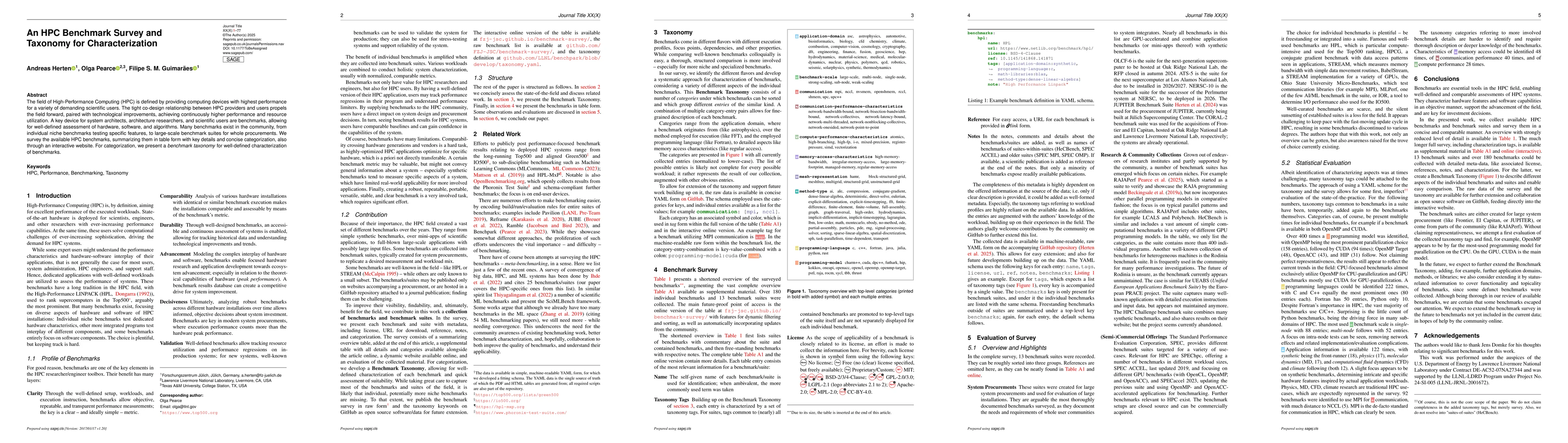 The field of High-Performance Computing (HPC) is defined by providing computing devices with highest performance for a variety of demanding scientific users. The tight co-design relationship between HPC providers and users propels the field forward, paired with technological improvements, achieving continuously higher performance and resource utilization. A key device for system architects, architecture researchers, and scientific users are benchmarks, allowing for well-defined assessment of hardware, software, and algorithms. Many benchmarks exist in the community, from individual niche benchmarks testing specific features, to large-scale benchmark suites for whole procurements. We survey the available HPC benchmarks, summarizing them in table form with key details and concise categorization, also through an interactive website. For categorization, we present a benchmark taxonomy for well-defined characterization of benchmarks.
