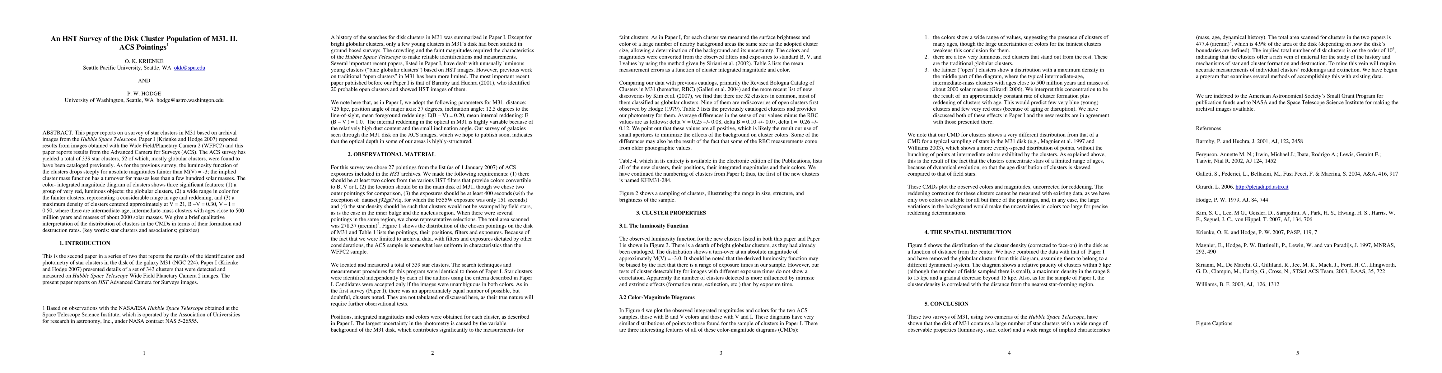 This paper reports on a survey of star clusters in M31 based on archival images from the Hubble Space Telescope. Paper I (Krienke and Hodge 2007) reported results from images obtained with the Wide Field/Planetary Camera 2 (WFPC2) and this paper reports results from the Advanced Camera for Surveys (ACS). The ACS survey has yielded a total of 339 star clusters. The color- integrated magnitude diagram of clusters shows three significant features: (1) a group of very red, luminous objects: the globular clusters, (2) a wide range in color for the fainter clusters, representing a considerable range in age and reddening, and (3) a maximum density of intermediate-age, intermediate-mass clusters with ages close to 500 million years and masses of about 2000 solar masses. We give a brief qualitative interpretation of the distribution of clusters in the CMDs in terms of their formation and destruction rates.