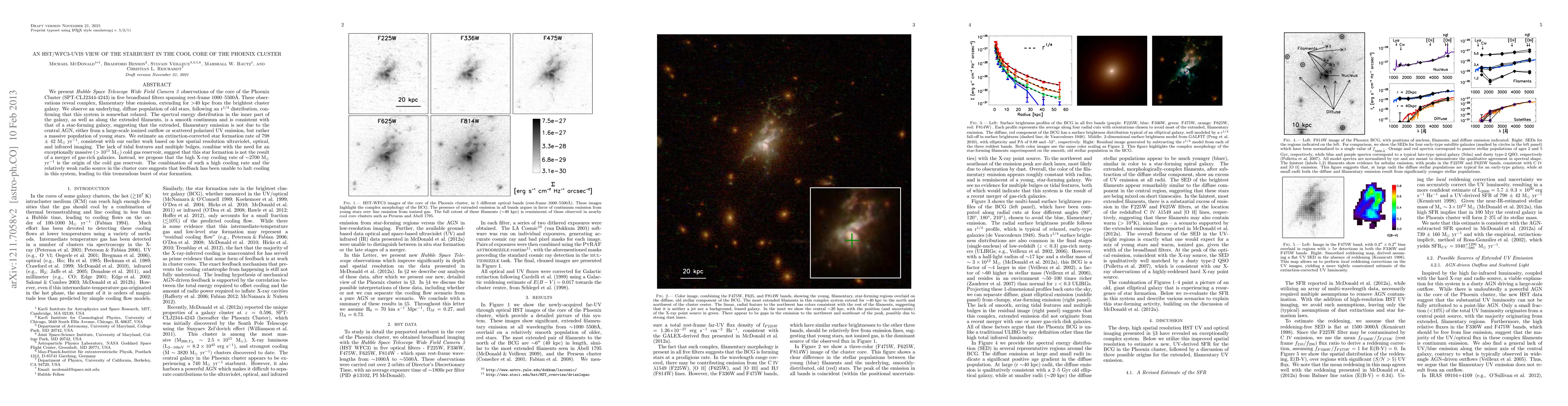 We present Hubble Space Telescope Wide Field Camera 3 observations of the core of the Phoenix Cluster SPT-CLJ2344-4243 in five broadband filters spanning rest-frame 1000--5500A. These observations reveal complex, filamentary blue emission, extending for >40kpc from the brightest cluster galaxy. We observe an underlying, diffuse population of old stars, following an r^1/4 distribution, confirming that this system is somewhat relaxed. The spectral energy distribution in the inner part of the galaxy, as well as along the extended filaments, is a smooth continuum and is consistent with that of a star-forming galaxy, suggesting that the extended, filamentary emission is not due to the central AGN, either from a large-scale ionized outflow or scattered polarized UV emission, but rather a massive population of young stars. We estimate an extinction-corrected star formation rate of 798 +/- 42 Msun/yr, consistent with our earlier work based on low spatial resolution ultraviolet, optical, and infrared imaging. The lack of tidal features and multiple bulges, combine with the need for an exceptionally massive (>10^11 Msun) cold gas reservoir, suggest that this star formation is not the result of a merger of gas-rich galaxies. Instead, we propose that the high X-ray cooling rate of ~2700 Msun/yr is the origin of the cold gas reservoir. The combination of such a high cooling rate and the relatively weak radio source in the cluster core suggests that feedback has been unable to halt cooling in this system, leading to this tremendous burst of star formation.