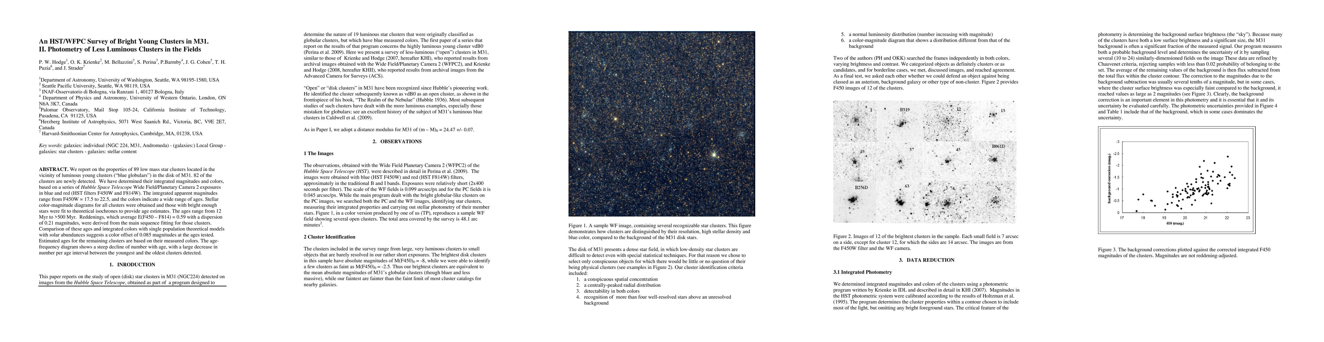This study, using Hubble Space Telescope data, identified and analyzed 89 low-mass star clusters in M31's disk near luminous clusters. The clusters' ages, ranging from 12 Myr to over 500 Myr, were estimated via color-magnitude diagram fitting and comparison with theoretical isochrones. The research found a color offset and a steep decline in cluster numbers with increasing age.