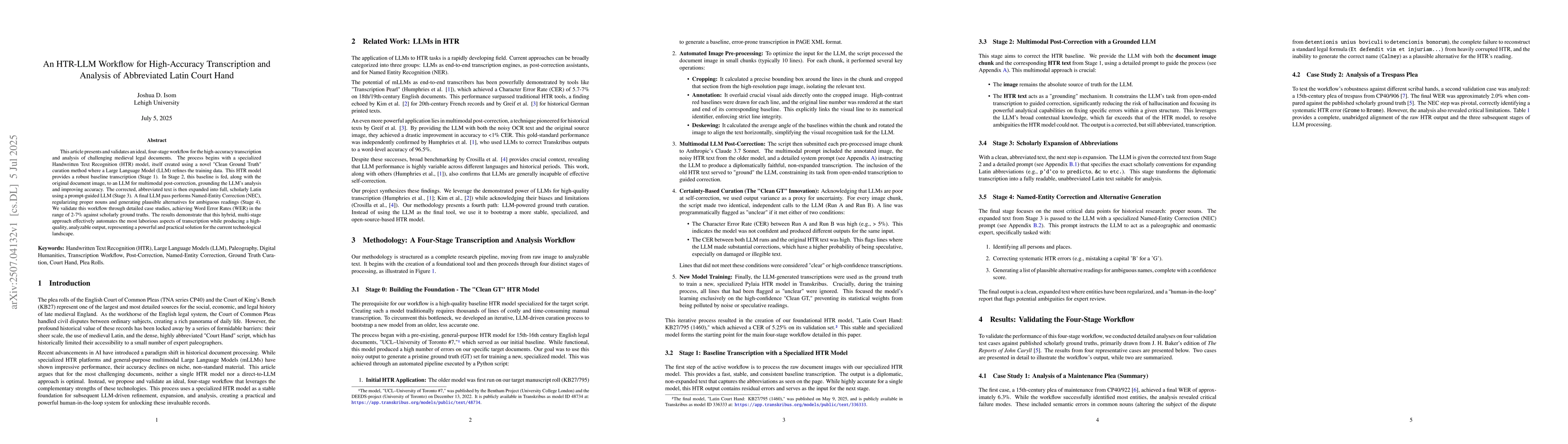 This article presents and validates an ideal, four-stage workflow for the high-accuracy transcription and analysis of challenging medieval legal documents. The process begins with a specialized Handwritten Text Recognition (HTR) model, itself created using a novel "Clean Ground Truth" curation method where a Large Language Model (LLM) refines the training data. This HTR model provides a robust baseline transcription (Stage 1). In Stage 2, this baseline is fed, along with the original document image, to an LLM for multimodal post-correction, grounding the LLM's analysis and improving accuracy. The corrected, abbreviated text is then expanded into full, scholarly Latin using a prompt-guided LLM (Stage 3). A final LLM pass performs Named-Entity Correction (NEC), regularizing proper nouns and generating plausible alternatives for ambiguous readings (Stage 4). We validate this workflow through detailed case studies, achieving Word Error Rates (WER) in the range of 2-7% against scholarly ground truths. The results demonstrate that this hybrid, multi-stage approach effectively automates the most laborious aspects of transcription while producing a high-quality, analyzable output, representing a powerful and practical solution for the current technological landscape.