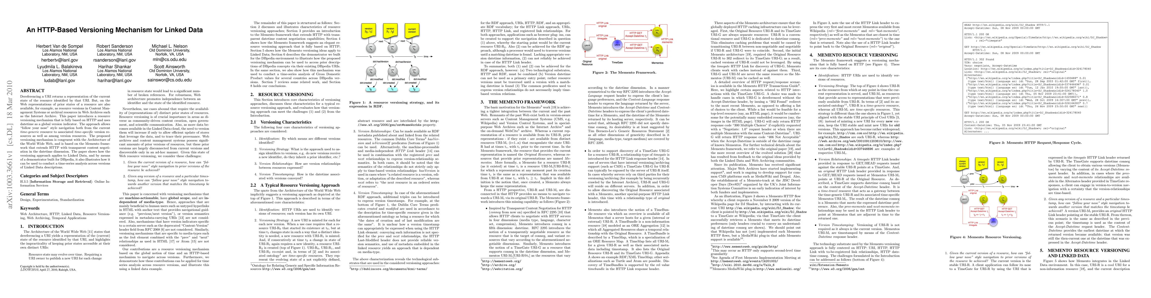 Dereferencing a URI returns a representation of the current state of the resource identified by that URI. But, on the Web representations of prior states of a resource are also available, for example, as resource versions in Content Management Systems or archival resources in Web Archives such as the Internet Archive. This paper introduces a resource versioning mechanism that is fully based on HTTP and uses datetime as a global version indicator. The approach allows "follow your nose" style navigation both from the current time-generic resource to associated time-specific version resources as well as among version resources. The proposed versioning mechanism is congruent with the Architecture of the World Wide Web, and is based on the Memento framework that extends HTTP with transparent content negotiation in the datetime dimension. The paper shows how the versioning approach applies to Linked Data, and by means of a demonstrator built for DBpedia, it also illustrates how it can be used to conduct a time-series analysis across versions of Linked Data descriptions.