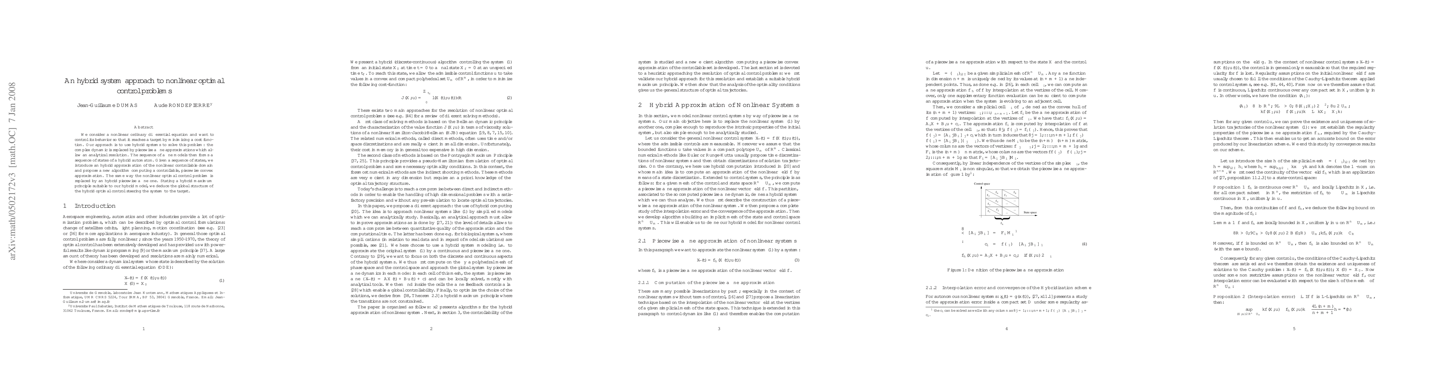 We consider a nonlinear ordinary differential equation and want to control its behavior so that it reaches a target by minimizing a cost function. Our approach is to use hybrid systems to solve this problem: the complex dynamic is replaced by piecewise affine approximations which allow an analytical resolution. The sequence of affine models then forms a sequence of states of a hybrid automaton. Given a sequence of states, we introduce an hybrid approximation of the nonlinear controllable domain and propose a new algorithm computing a controllable, piecewise convex approximation. The same way the nonlinear optimal control problem is replaced by an hybrid piecewise affine one. Stating a hybrid maximum principle suitable to our hybrid model, we deduce the global structure of the hybrid optimal control steering the system to the target.