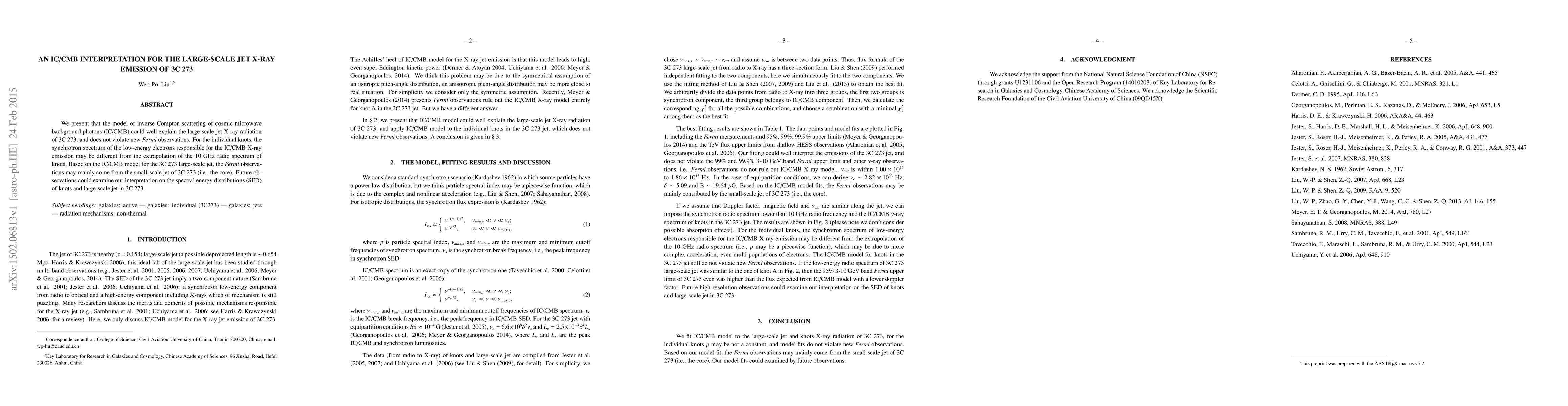 The paper proposes that inverse Compton scattering of cosmic microwave background photons (IC/CMB) explains the large-scale jet X-ray emission of 3C 273 without conflicting with new Fermi observations. Future observations are suggested to verify the model's predictions on the spectral energy distributions of 3C 273's knots and large-scale jet.