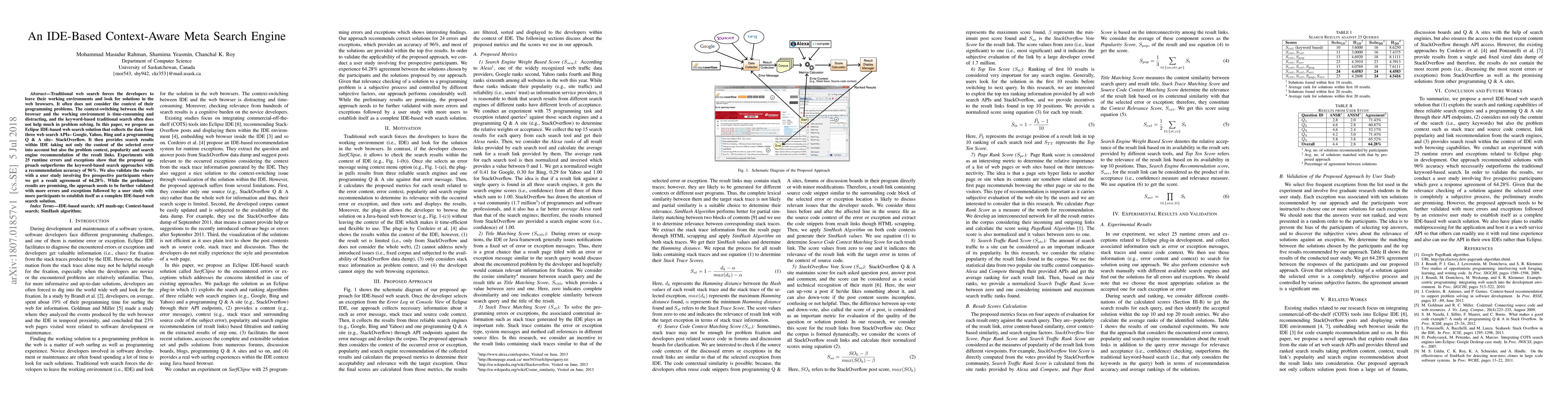 The paper presents a context-aware meta search engine integrated into an IDE, utilizing data from multiple web search APIs and a programming Q&A site, employing various metrics for result ranking and relevance assessment.