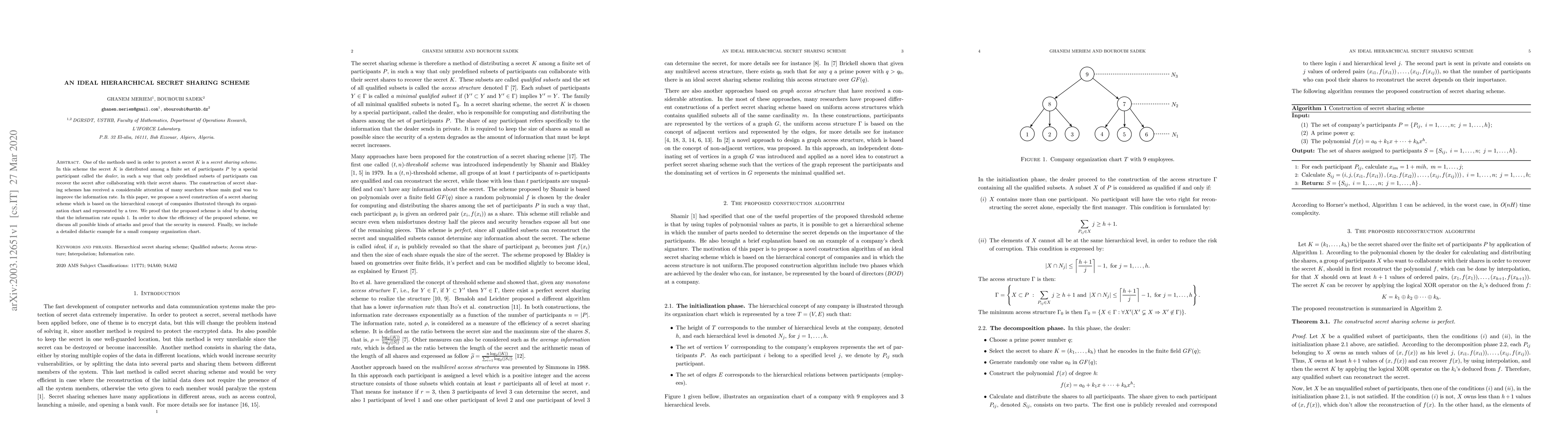 This paper proposes a novel hierarchical secret sharing scheme based on a tree structure representing a company's organizational chart, proving it ideal with an information rate of 1. It also demonstrates the scheme's security against various attacks and provides a detailed example for a small company.