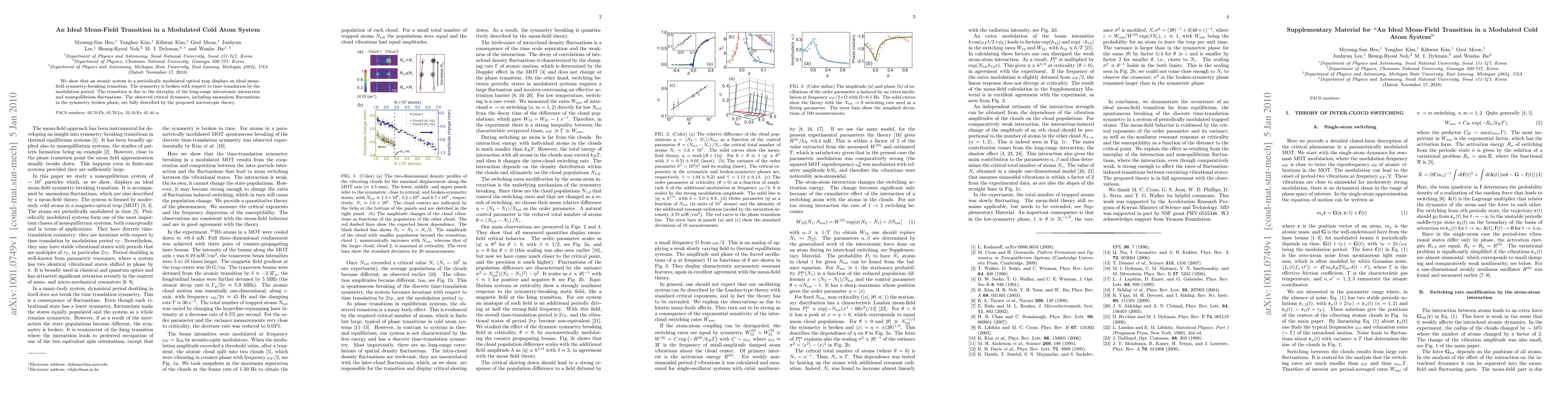 We show that an atomic system in a periodically modulated optical trap displays an ideal mean-field symmetry-breaking transition. The symmetry is broken with respect to time translation by the modulation period. The transition is due to the interplay of the long-range interatomic interaction and nonequilibrium fluctuations. The observed critical dynamics, including anomalous fluctuations in the symmetry broken phase, are fully described by the proposed microscopic theory.