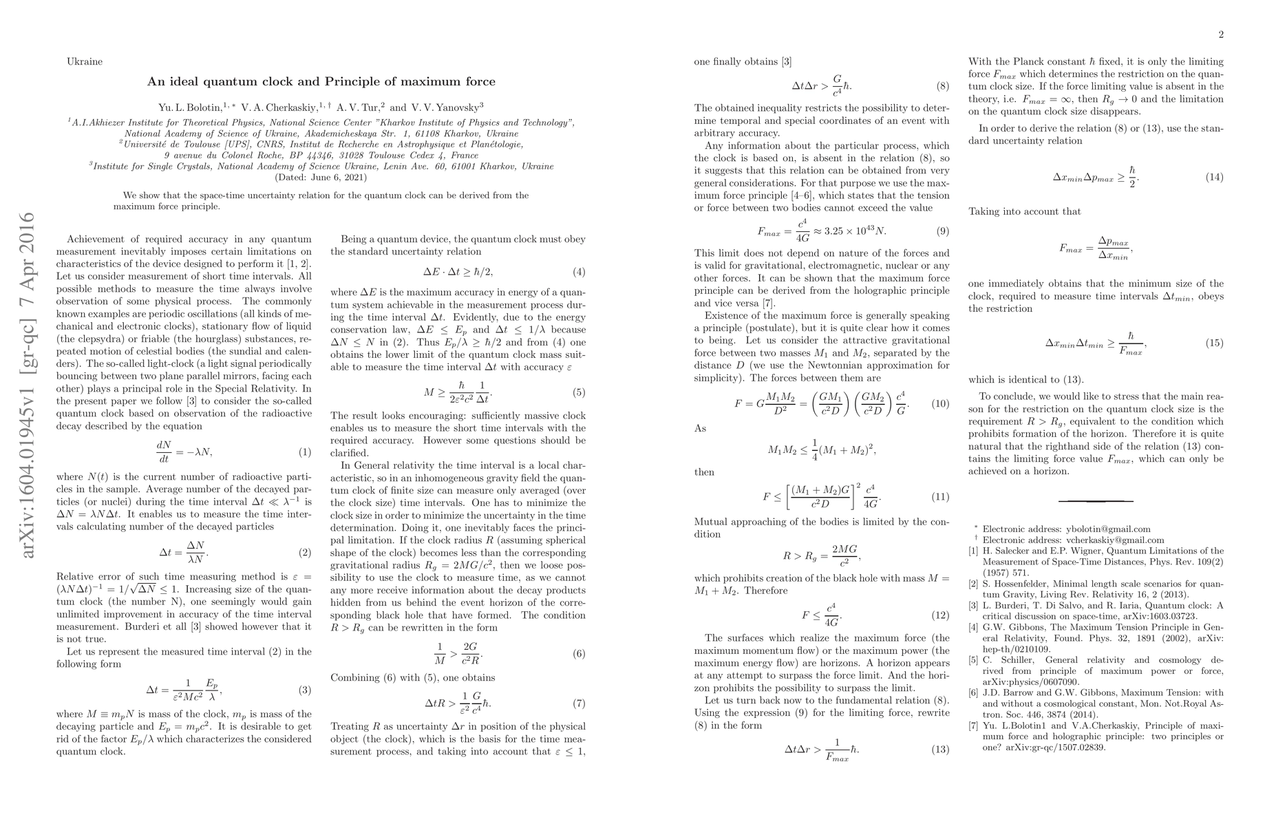 We show that the space-time uncertainty relation for the quantum clock can be derived from the maximum force principle.