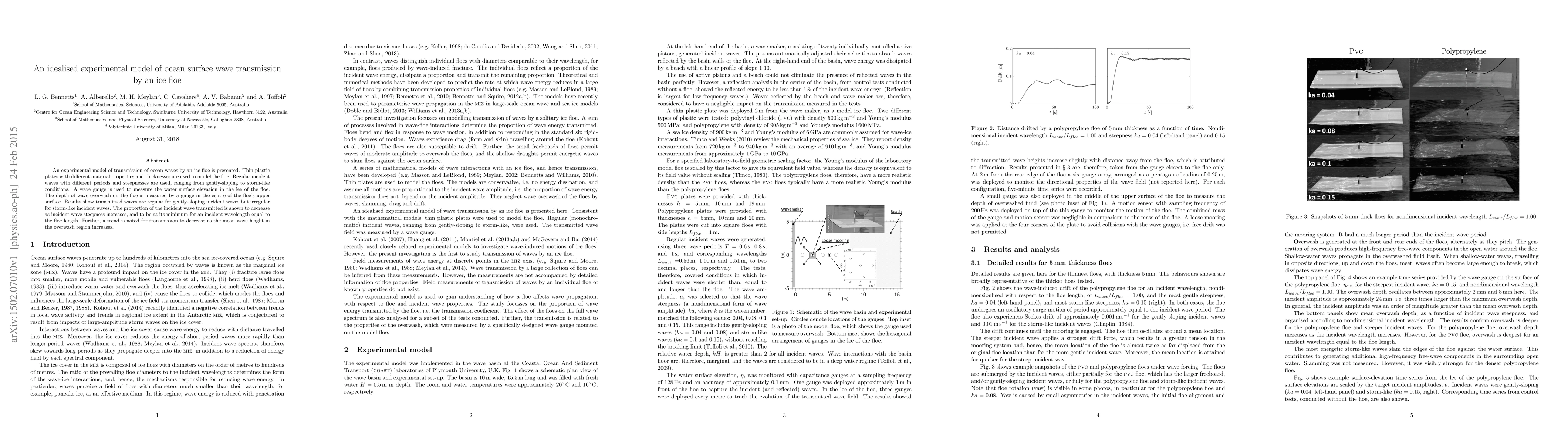 This paper presents an experimental model using thin plastic plates to simulate ocean wave transmission through an ice floe under varying wave conditions. Results indicate that wave transmission regularity and proportion decrease with increasing wave steepness and mean wave height, with minimal transmission occurring when the incident wavelength equals the floe length.