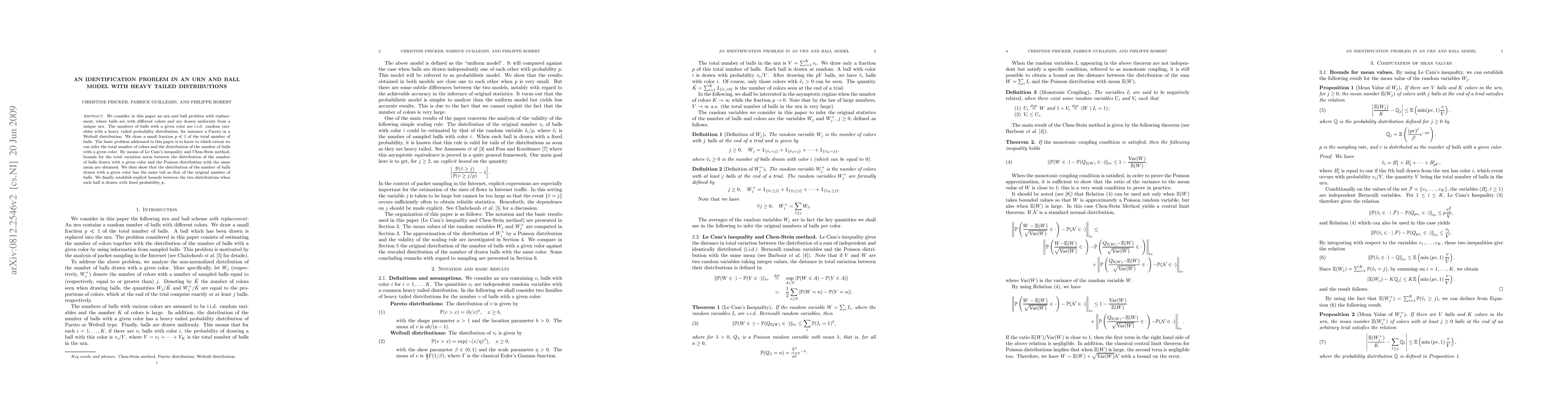 We consider in this paper an urn and ball problem with replacement, where balls are with different colors and are drawn uniformly from a unique urn. The numbers of balls with a given color are i.i.d. random variables with a heavy tailed probability distribution, for instance a Pareto or a Weibull distribution. We draw a small fraction $p\ll 1$ of the total number of balls. The basic problem addressed in this paper is to know to which extent we can infer the total number of colors and the distribution of the number of balls with a given color. By means of Le Cam's inequality and Chen-Stein method, bounds for the total variation norm between the distribution of the number of balls drawn with a given color and the Poisson distribution with the same mean are obtained. We then show that the distribution of the number of balls drawn with a given color has the same tail as that of the original number of balls. We finally establish explicit bounds between the two distributions when each ball is drawn with fixed probability $p$.