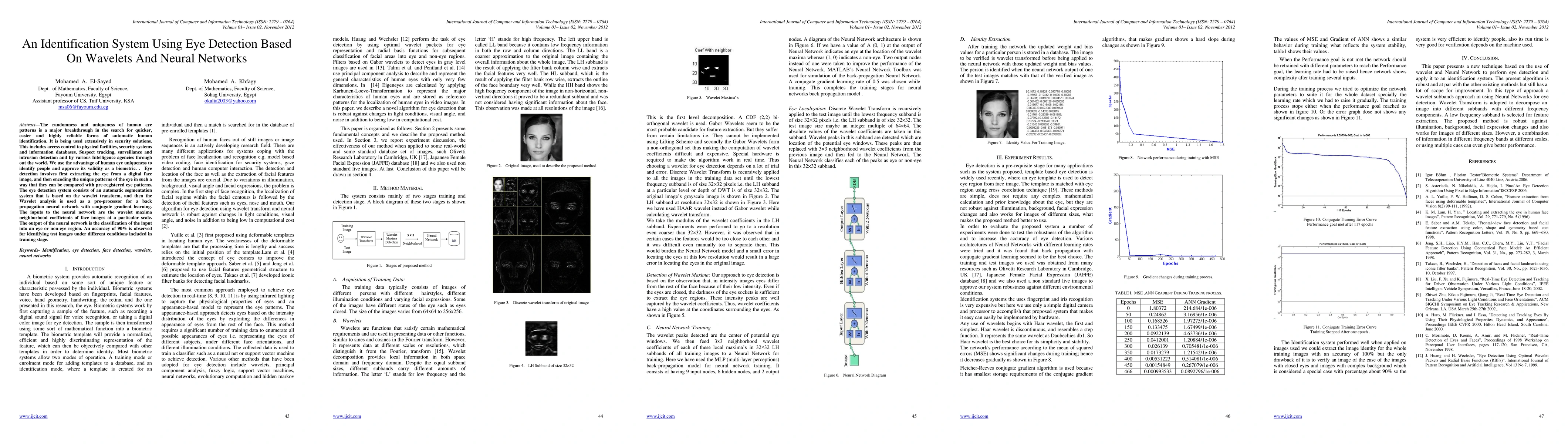 The randomness and uniqueness of human eye patterns is a major breakthrough in the search for quicker, easier and highly reliable forms of automatic human identification. It is being used extensively in security solutions. This includes access control to physical facilities, security systems and information databases, Suspect tracking, surveillance and intrusion detection and by various Intelligence agencies through out the world. We use the advantage of human eye uniqueness to identify people and approve its validity as a biometric. . Eye detection involves first extracting the eye from a digital face image, and then encoding the unique patterns of the eye in such a way that they can be compared with pre-registered eye patterns. The eye detection system consists of an automatic segmentation system that is based on the wavelet transform, and then the Wavelet analysis is used as a pre-processor for a back propagation neural network with conjugate gradient learning. The inputs to the neural network are the wavelet maxima neighborhood coefficients of face images at a particular scale. The output of the neural network is the classification of the input into an eye or non-eye region. An accuracy of 90% is observed for identifying test images under different conditions included in training stage.