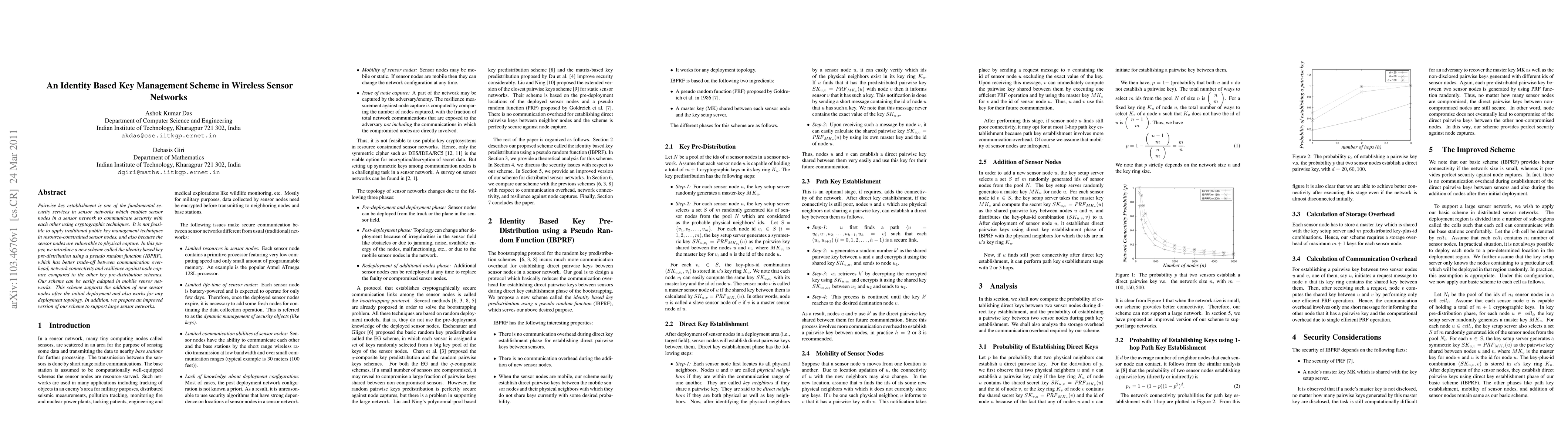 This paper introduces an Identity Based Key Pre-distribution using a Pseudo Random Function (IBPRF) scheme for secure pairwise key establishment in wireless sensor networks, offering a better balance between communication overhead, network connectivity, and resilience against node capture. The scheme supports dynamic addition of new nodes and is adaptable to various network topologies.
