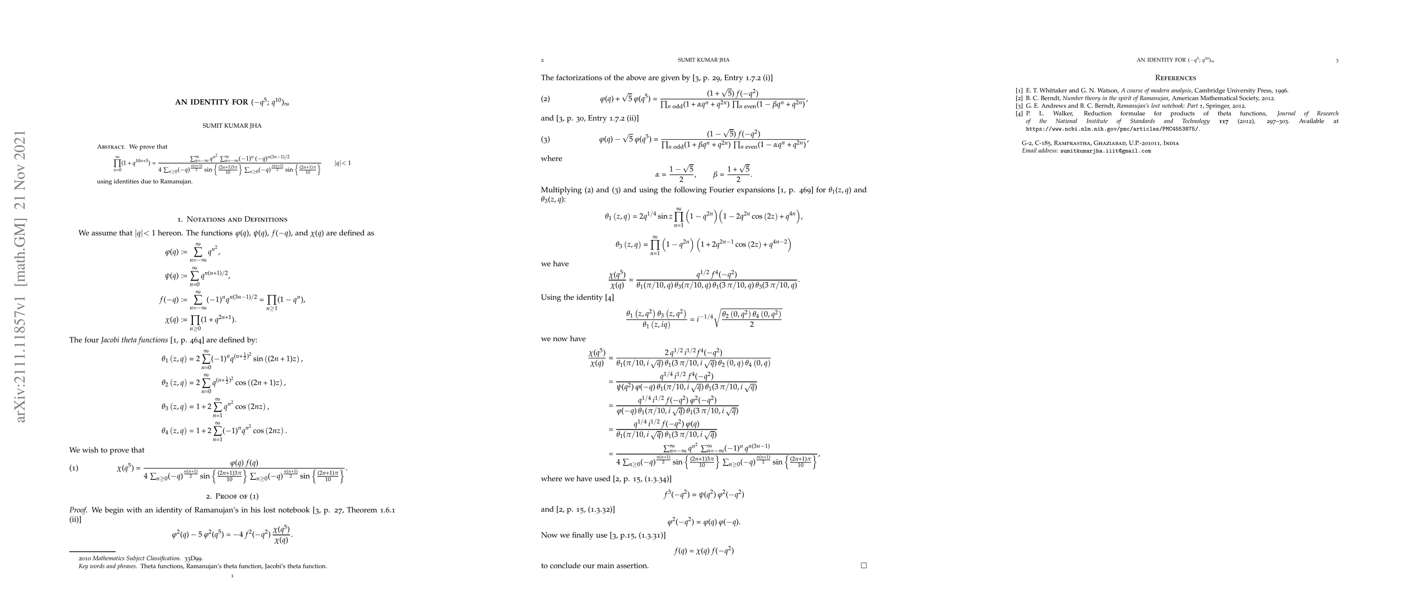 We prove that $$ \prod_{n=0}^{\infty}(1+q^{10n+5}) = \frac{\sum_{n=-\infty}^{\infty}q^{n^{2}}\, \sum_{n=-\infty}^{\infty}(-1)^{n}\, (-q)^{n(3n-1)/2}}{4\, \sum_{n\geq 0}(-q)^{\frac{n(n+1)}{2}}\sin \left\{\frac{(2n+1)3\pi}{10}\right\}\, \sum_{n\geq 0}(-q)^{\frac{n(n+1)}{2}}\sin \left\{\frac{(2n+1)\pi}{10}\right\}} \qquad |q|<1 $$ using identities due to Ramanujan.