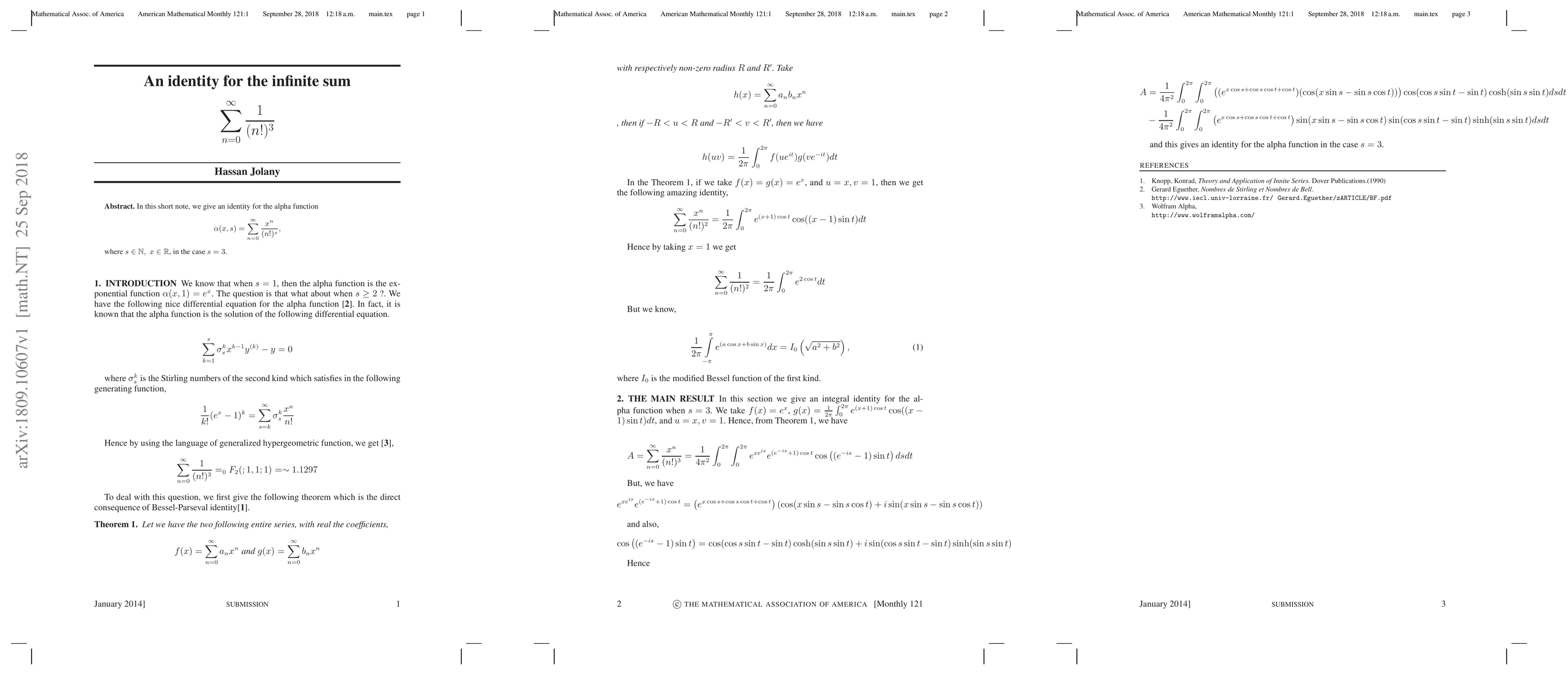 This paper establishes an identity for the infinite sum $\sum_{n=0}^\infty\frac{1}{(n!)^3}$, which is a special case of the $\alpha$ function $\alpha(x,s)$ when $s=3$. The result provides a closed form for this specific series.