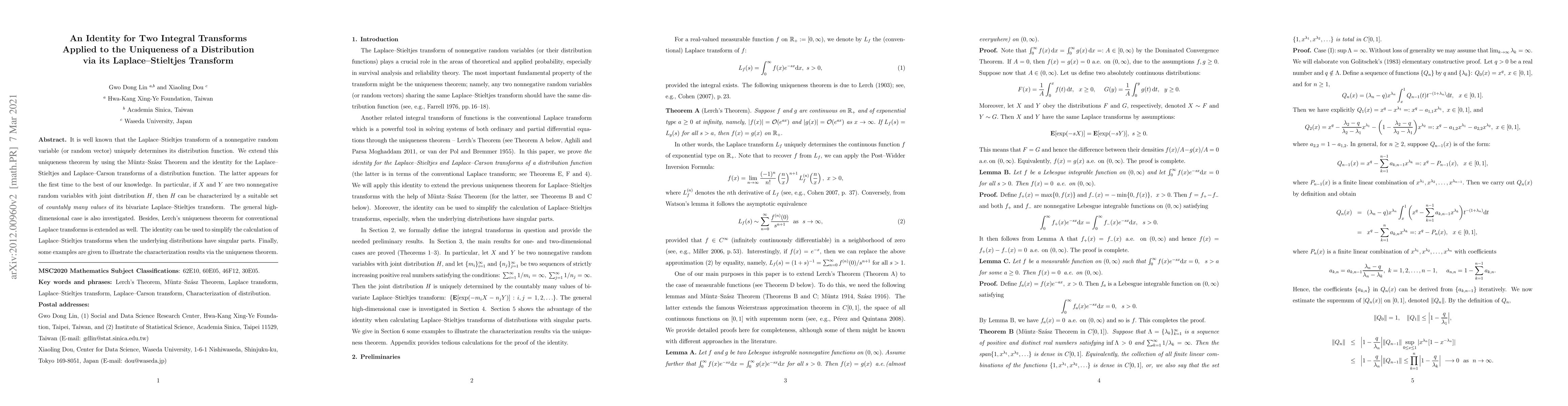This paper extends the uniqueness theorem for distribution functions via their Laplace-Stieltjes transforms, introducing a new identity for Laplace-Stieltjes and Laplace-Carson transforms. It characterizes joint distributions using countably many values of their bivariate Laplace-Stieltjes transforms and extends Lerch's theorem for conventional Laplace transforms.