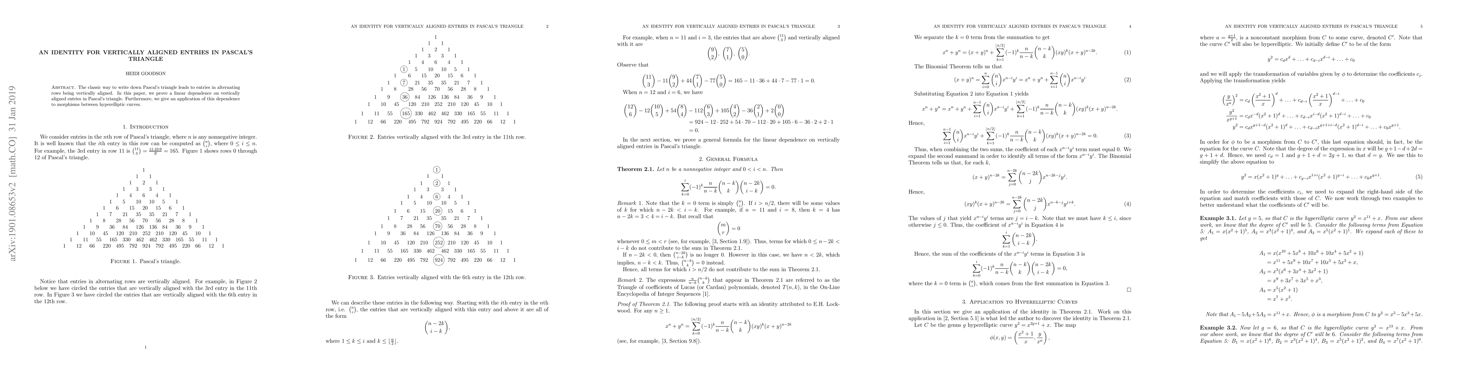 The classic way to write down Pascal's triangle leads to entries in alternating rows being vertically aligned. In this paper, we prove a linear dependence on vertically aligned entries in Pascal's triangle. Furthermore, we give an application of this dependence to morphisms between hyperelliptic curves.
