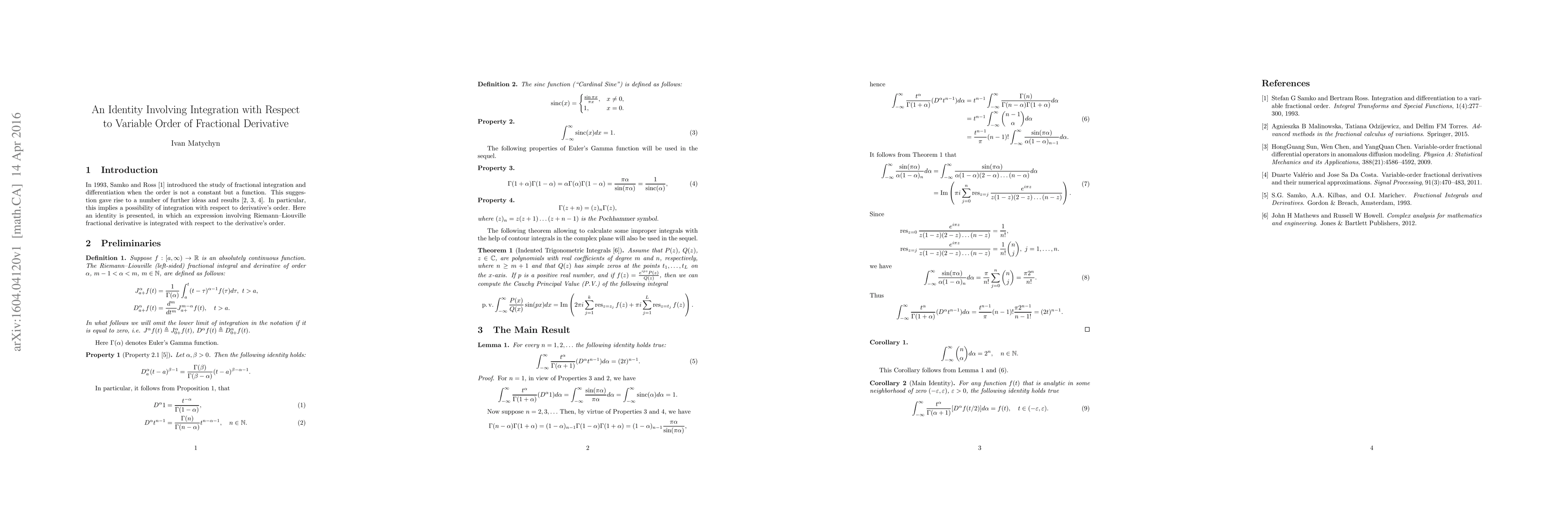 In 1993, Samko and Ross introduced the study of fractional integration and differentiation when the order is not a constant but a function. This suggestion gave rise to a number of further ideas and results. In particular, this implies a possibility of integration with respect to derivative's order. Here an identity is presented, in which an expression involving Riemann--Liouville fractional derivative is integrated with respect to the derivative's order.