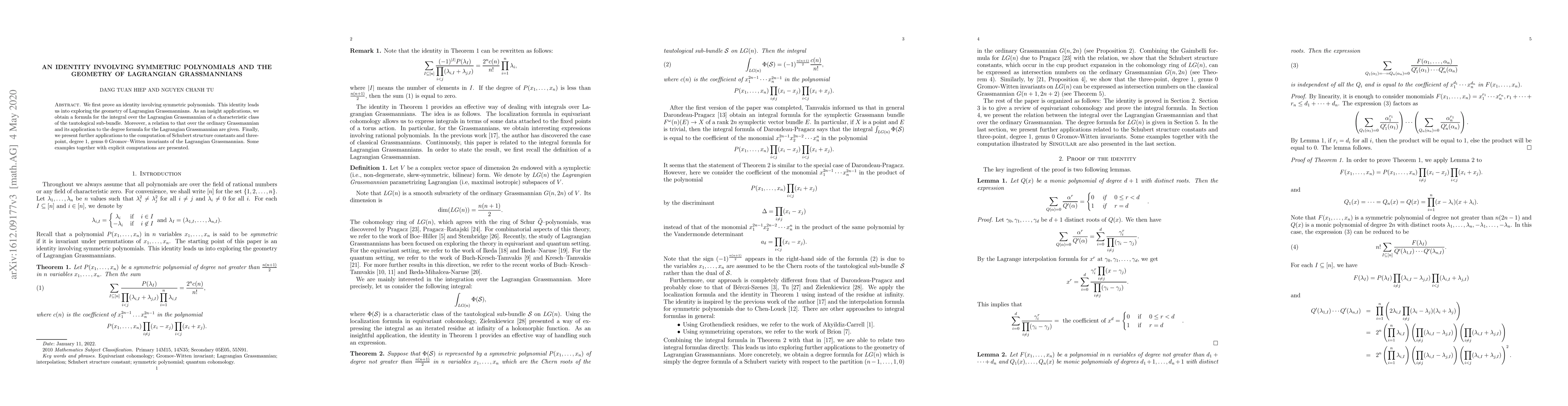 We first prove an identity involving symmetric polynomials. This identity leads us into exploring the geometry of Lagrangian Grassmannians. As an insight applications, we obtain a formula for the integral over the Lagrangian Grassmannian of a characteristic class of the tautological sub-bundle. Moreover, a relation to that over the ordinary Grassmannian and its application to the degree formula for the Lagrangian Grassmannian are given. Finally, we present further applications to the computation of Schubert structure constants and three-point, degree $1$, genus $0$ Gromov--Witten invariants of the Lagrangian Grassmannian. Some examples together with explicit computations are presented.