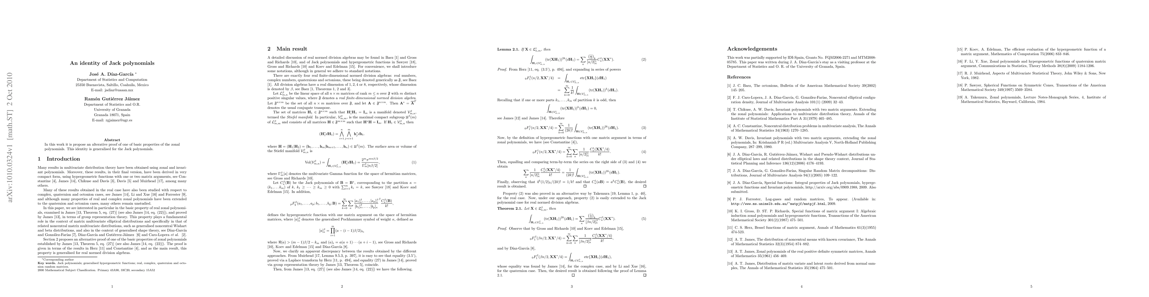 In this work it is propose an alterative proof of one of basic properties of the zonal polynomials. This identity is generalised for the Jack polynomials.