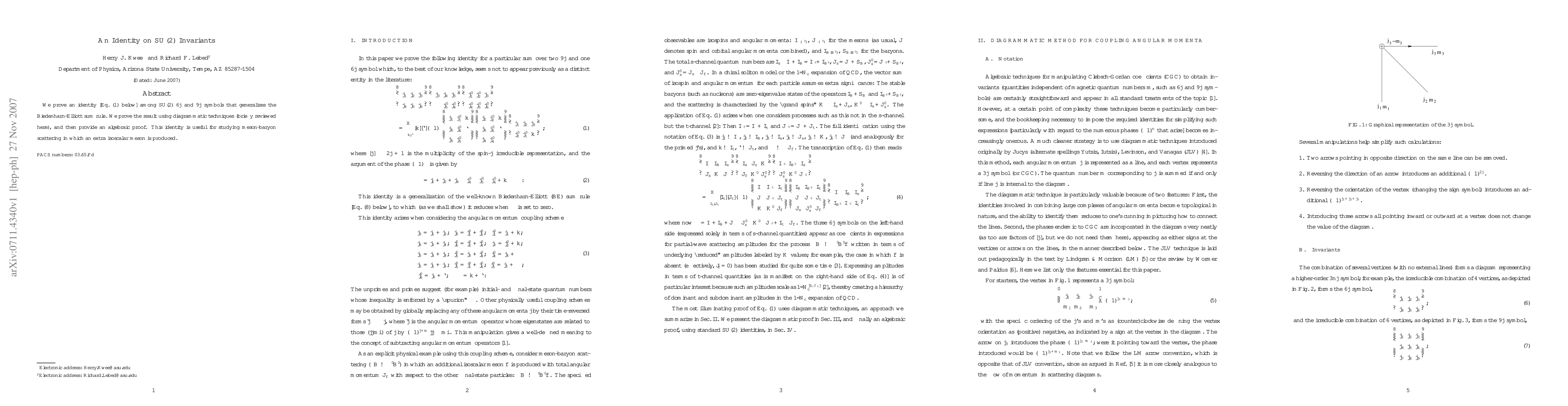 This paper presents an identity among SU(2) 6j and 9j symbols that generalizes the Biedenharn-Elliott sum rule, proven using both diagrammatic and algebraic techniques. This identity is significant for studying meson-baryon scattering processes involving an extra isoscalar meson.