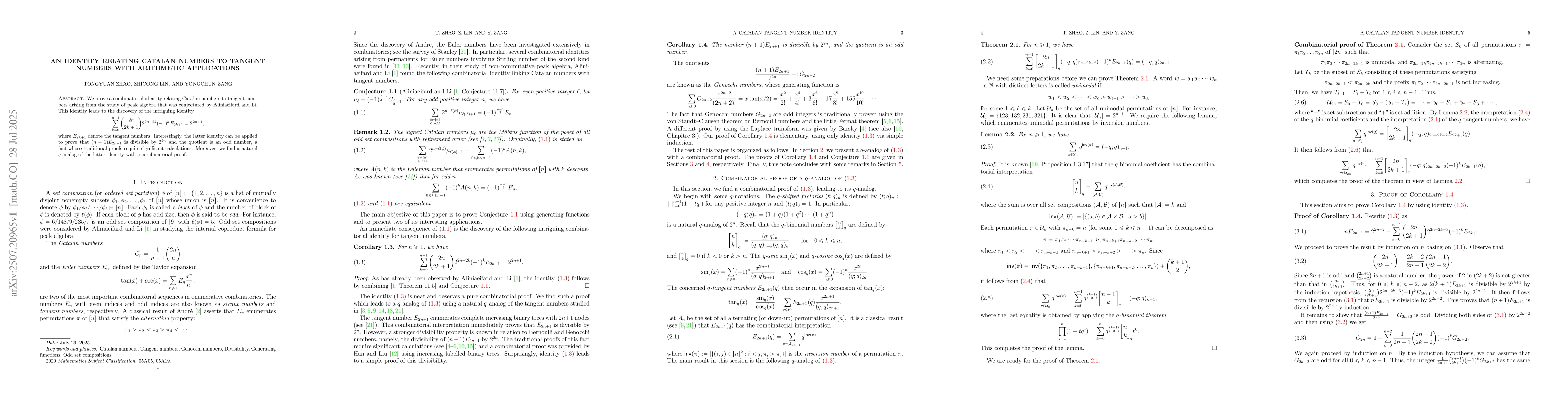 We prove a combinatorial identity relating Catalan numbers to tangent numbers arising from the study of peak algebra that was conjectured by Aliniaeifard and Li. This identity leads to the discovery of the intriguing identity $$ \sum_{k=0}^{n-1}{2n\choose 2k+1}2^{2n-2k}(-1)^{k}E_{2k+1}=2^{2n+1}, $$ where $E_{2k+1}$ denote the tangent numbers. Interestingly, the latter identity can be applied to prove that $(n + 1)E_{2n+1}$ is divisible by $2^{2n}$ and the quotient is an odd number, a fact whose traditional proofs require significant calculations. Moreover, we find a natural $q$-analog of the latter identity with a combinatorial proof.