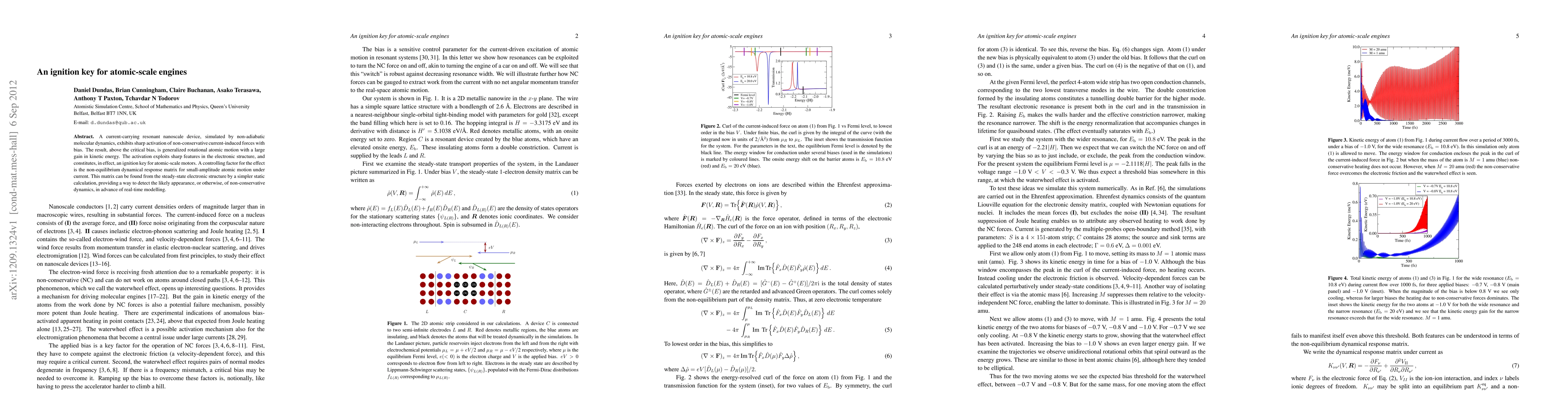 A current-carrying resonant nanoscale device, simulated by non-adiabatic molecular dynamics, exhibits sharp activation of non-conservative current-induced forces with bias. The result, above the critical bias, is generalized rotational atomic motion with a large gain in kinetic energy. The activation exploits sharp features in the electronic structure, and constitutes, in effect, an ignition key for atomic-scale motors. A controlling factor for the effect is the non-equilibrium dynamical response matrix for small-amplitude atomic motion under current. This matrix can be found from the steady-state electronic structure by a simpler static calculation, providing a way to detect the likely appearance, or otherwise, of non-conservative dynamics, in advance of real-time modelling.
