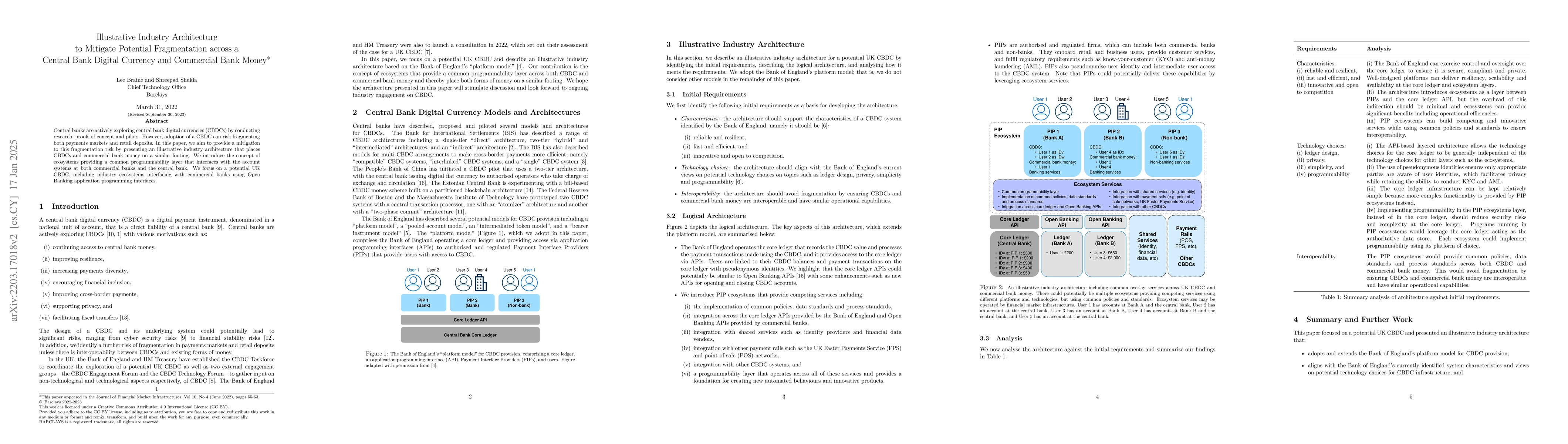 This paper proposes an industry architecture to mitigate fragmentation risks between central bank digital currencies (CBDCs) and commercial bank money by creating a unified ecosystem with a common programmability layer. It emphasizes the use of Open Banking APIs in the United Kingdom to integrate CBDCs and commercial bank systems on equal footing.