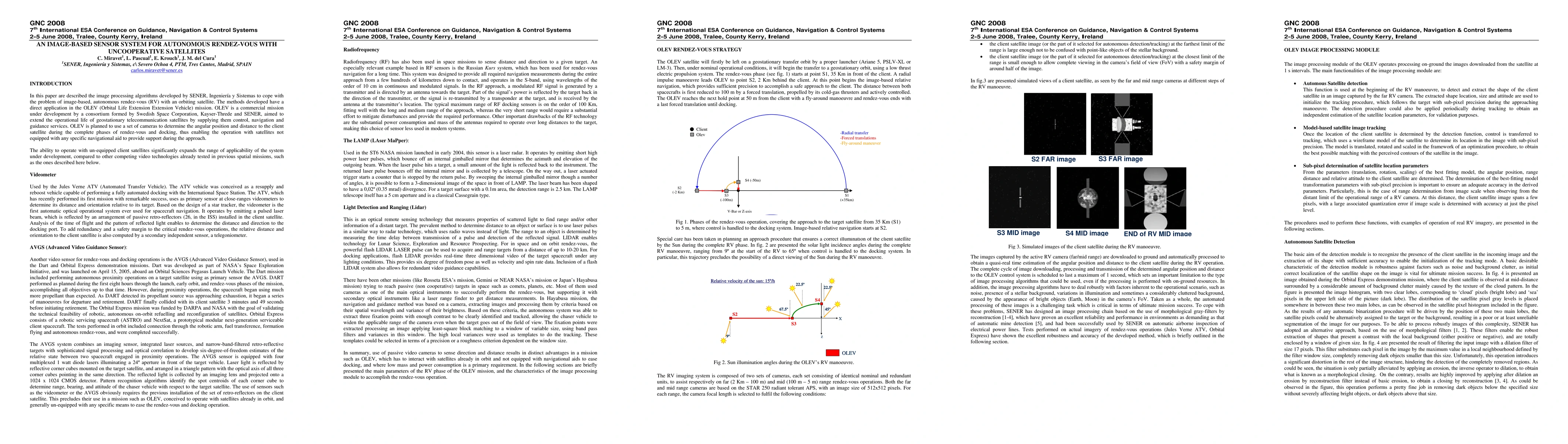 In this paper are described the image processing algorithms developed by SENER, Ingenieria y Sistemas to cope with the problem of image-based, autonomous rendez-vous (RV) with an orbiting satellite. The methods developed have a direct application in the OLEV (Orbital Life Extension Extension Vehicle) mission. OLEV is a commercial mission under development by a consortium formed by Swedish Space Corporation, Kayser-Threde and SENER, aimed to extend the operational life of geostationary telecommunication satellites by supplying them control, navigation and guidance services. OLEV is planned to use a set of cameras to determine the angular position and distance to the client satellite during the complete phases of rendez-vous and docking, thus enabling the operation with satellites not equipped with any specific navigational aid to provide support during the approach. The ability to operate with un-equipped client satellites significantly expands the range of applicability of the system under development, compared to other competing video technologies already tested in previous spatial missions, such as the ones described here below.