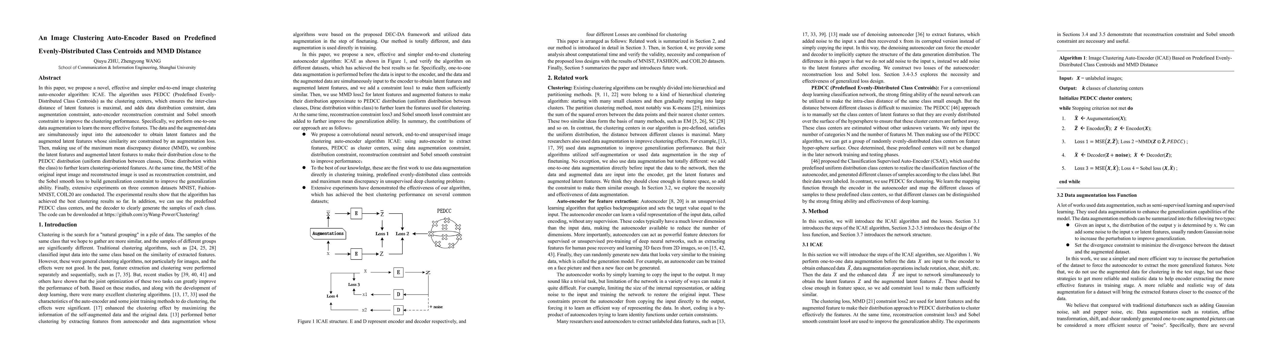 Researchers proposed ICAE, an image clustering auto-encoder that achieves best clustering results on MNIST, Fashion-MNIST, COIL20 datasets by using predefined class centroids and MMD distance.