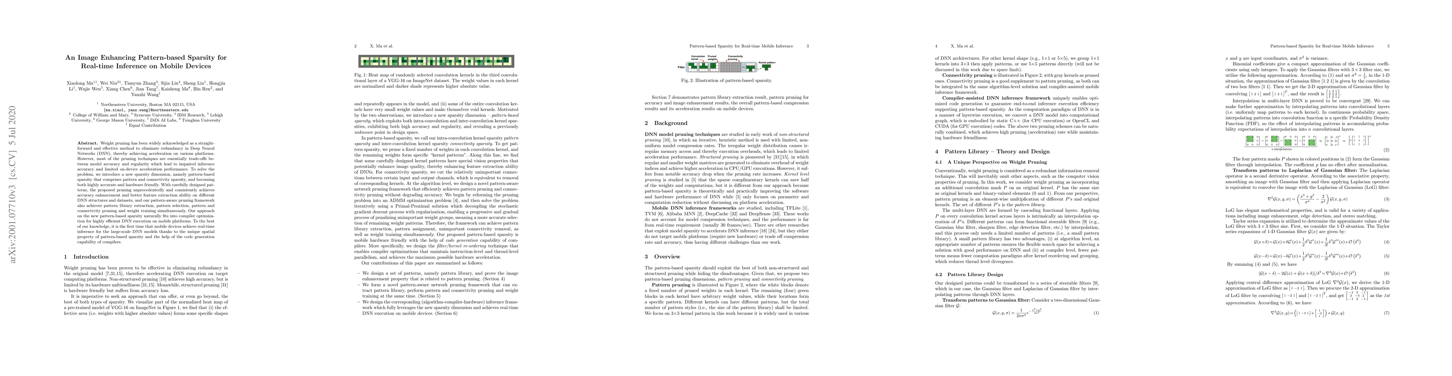This paper proposes a novel pattern-based sparsity method for weight pruning in Deep Neural Networks (DNN) to enhance accuracy and efficiency on mobile devices. The approach achieves real-time inference for large-scale DNN models by combining pattern and connectivity sparsity, leading to improved feature extraction and model performance.
