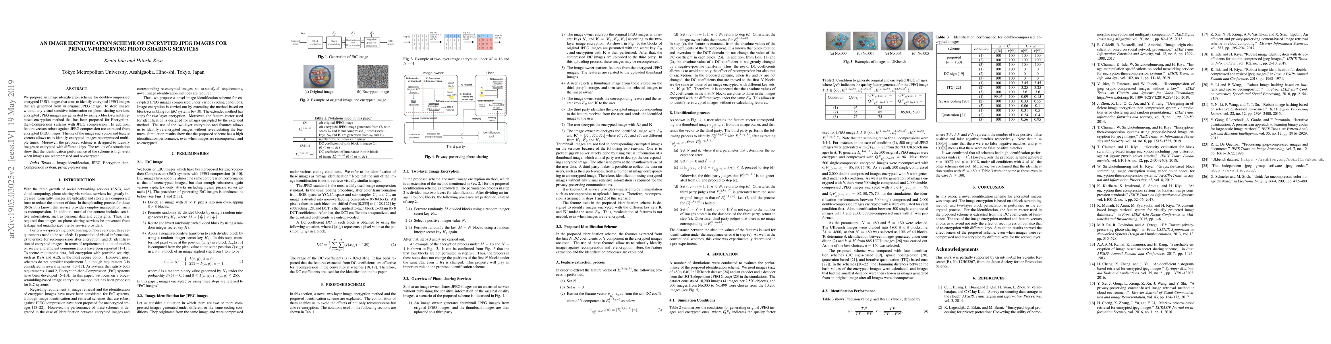 Researchers propose an image identification scheme for encrypted JPEG images to preserve photo sharing privacy, using block-scrambling-based encryption and feature vectors robust against compression.