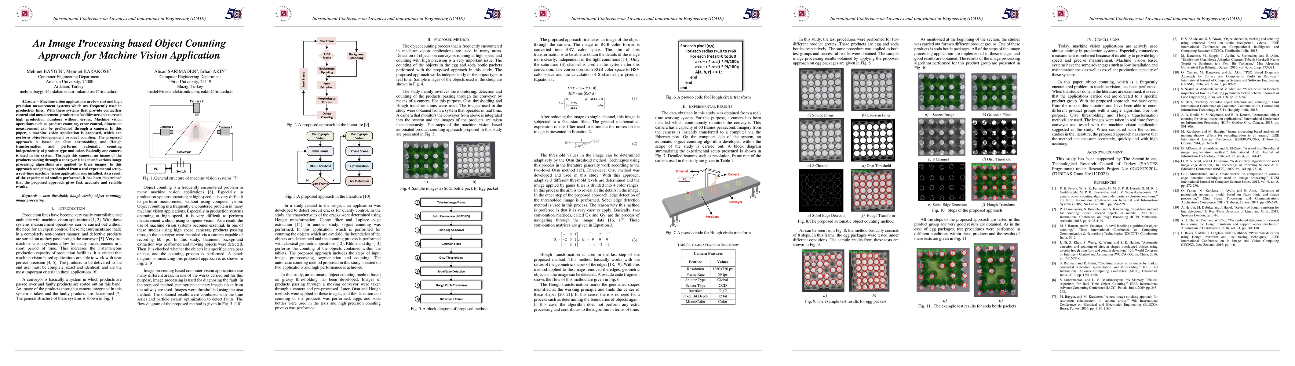 Machine vision applications are low cost and high precision measurement systems which are frequently used in production lines. With these systems that provide contactless control and measurement, production facilities are able to reach high production numbers without errors. Machine vision operations such as product counting, error control, dimension measurement can be performed through a camera. In this paper, a machine vision application is proposed, which can perform object-independent product counting. The proposed approach is based on Otsu thresholding and Hough transformation and performs automatic counting independently of product type and color. Basically one camera is used in the system. Through this camera, an image of the products passing through a conveyor is taken and various image processing algorithms are applied to these images. In this approach using images obtained from a real experimental setup, a real-time machine vision application was installed. As a result of the experimental studies performed, it has been determined that the proposed approach gives fast, accurate and reliable results.