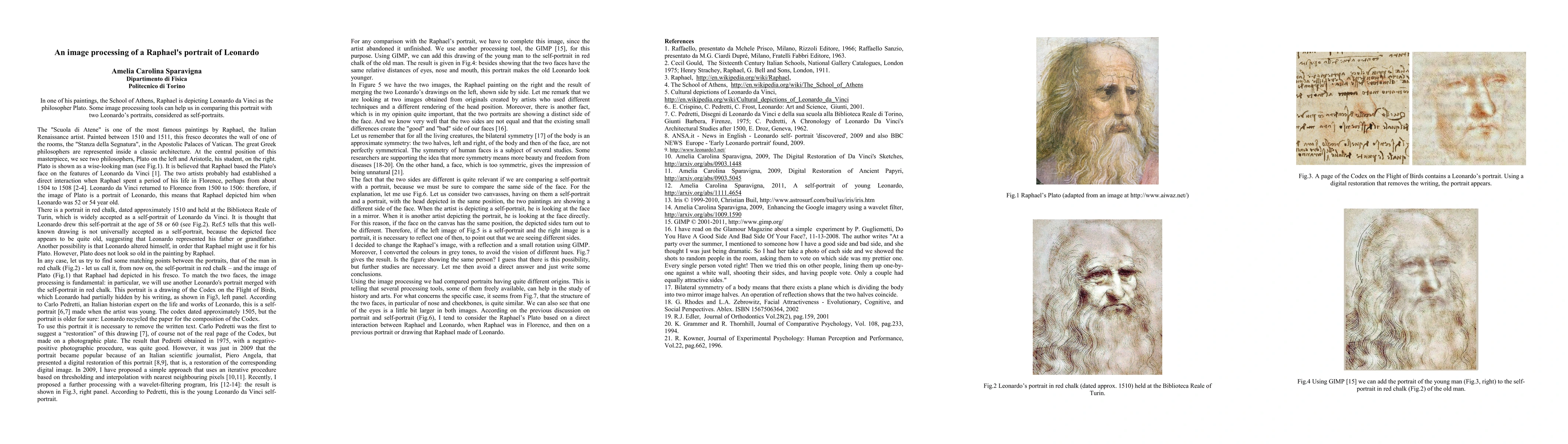In one of his paintings, the School of Athens, Raphael is depicting Leonardo da Vinci as the philosopher Plato. Some image processing tools can help us in comparing this portrait with two Leonardo's portraits, considered as self-portraits.