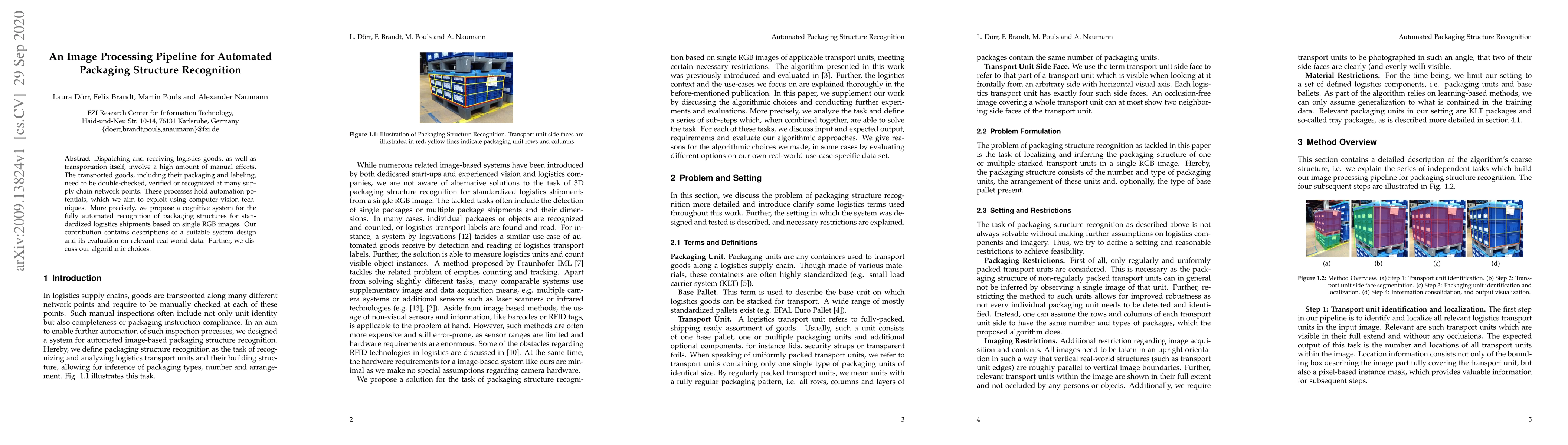 This paper proposes a computer vision-based system for fully automated recognition of standardized logistics packaging structures using single RGB images. The system design and evaluation on real-world data are detailed, along with discussions on the chosen algorithms.