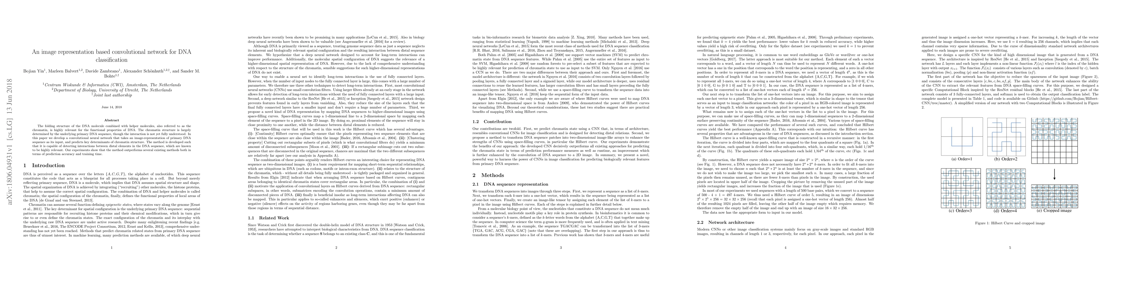 The folding structure of the DNA molecule combined with helper molecules, also referred to as the chromatin, is highly relevant for the functional properties of DNA. The chromatin structure is largely determined by the underlying primary DNA sequence, though the interaction is not yet fully understood. In this paper we develop a convolutional neural network that takes an image-representation of primary DNA sequence as its input, and predicts key determinants of chromatin structure. The method is developed such that it is capable of detecting interactions between distal elements in the DNA sequence, which are known to be highly relevant. Our experiments show that the method outperforms several existing methods both in terms of prediction accuracy and training time.