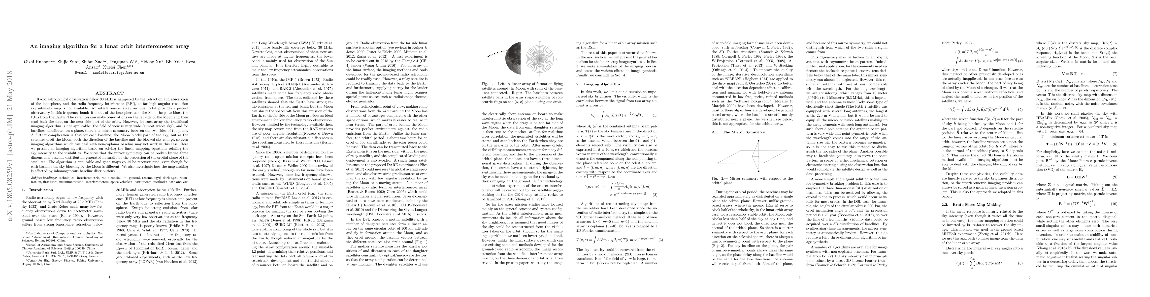 Radio astronomical observation below 30 MHz is hampered by the refraction and absorption of the ionosphere, and the radio frequency interference (RFI), so far high angular resolution sky intensity map is not available. An interferometer array on lunar orbit provides a perfect observatory in this frequency band: it is out of the ionosphere and the Moon helps to block the RFIs from the Earth. The satellites can make observations on the far side of the Moon and then send back the data on the near side part of the orbit. However, for such array the traditional imaging algorithm is not applicable: the field of view is very wide (almost whole sky), and for baselines distributed on a plane, there is a mirror symmetry between the two sides of the plane. A further complication is that for each baseline, the Moon blocks part of the sky, but as the satellites orbit the Moon, both the direction of the baseline and the blocked sky change, so even imaging algorithms which can deal with non-coplanar baseline may not work in this case. Here we present an imaging algorithm based on solving the linear mapping equations relating the sky intensity to the visibilities. We show that the mirror symmetry can be broken by the three dimensional baseline distribution generated naturally by the precession of the orbital plane of the satellites. The algorithm is applicable and good maps could be reconstructed, even though for each baseline the sky blocking by the Moon is different. We also investigate how the map-making is affected by inhomogeneous baseline distributions.