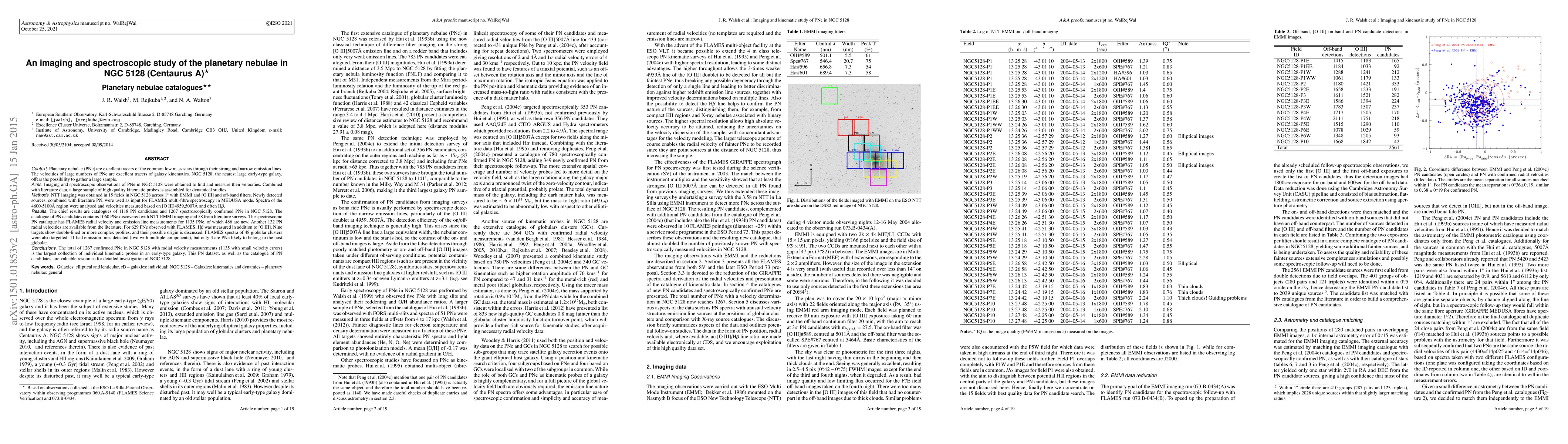 This study presents imaging and spectroscopic observations of planetary nebulae (PNe) in NGC 5128 (Centaurus A), resulting in catalogues of 1118 PN candidates and 1267 confirmed PNe, including 486 newly detected nebulae. The data provide valuable insights into the stellar population and kinematics of NGC 5128.