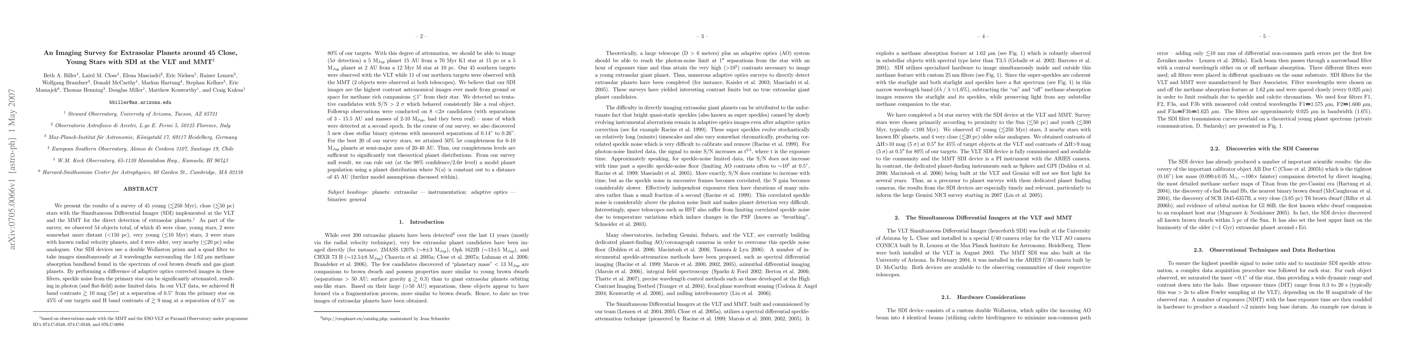 We present the results of a survey of 45 young (<250 Myr), close (<50 pc) stars with the Simultaneous Differential Imager (SDI) implemented at the VLT and the MMT for the direct detection of extrasolar planets. As part of the survey, we observed 54 objects total, of which 45 were close, young stars, 2 were somewhat more distant (<150 pc), very young (<10 Myr) stars, 3 were stars with known radial velocity planets, and 4 were older, very nearby (<20 pc) solar analogues. Our SDI devices use a double Wollaston prism and a quad filter to take images simultaneously at 3 wavelengths surrounding the 1.62 um methane absorption bandhead found in the spectrum of cool brown dwarfs and gas giant planets. In our VLT data, we achieved H band contrasts > 10 mag (5 sigma) at a separation of 0.5" from the primary star on 45% of our targets and H band contrasts of > 9 mag at a separation of 0.5'' on 80% of our targets. With this degree of attenuation, we should be able to image (5sigma detection) a 5 M_{Jup} planet 15 AU from a 70 Myr K1 star at 15 pc or a 5 M_{Jup} planet at 2 AU from a 12 Myr M star at 10 pc. We believe that our SDI images are the highest contrast astronomical images ever made from ground or space for methane rich companions <1'' from their star. For the best 20 of our survey stars, we attained 50% 5 sigma completeness for 6-10 M_Jup planets at semi-major axes of 20-40 AU. Thus, our completeness levels are sufficient to significantly test theoretical planet distributions. From our survey null result, we can rule out (at the 98% confidence/2.0sigma level) a model planet population using a planet distribution where N(a) $\propto$ constant out to a distance of 45 AU (further model assumptions discussed within).