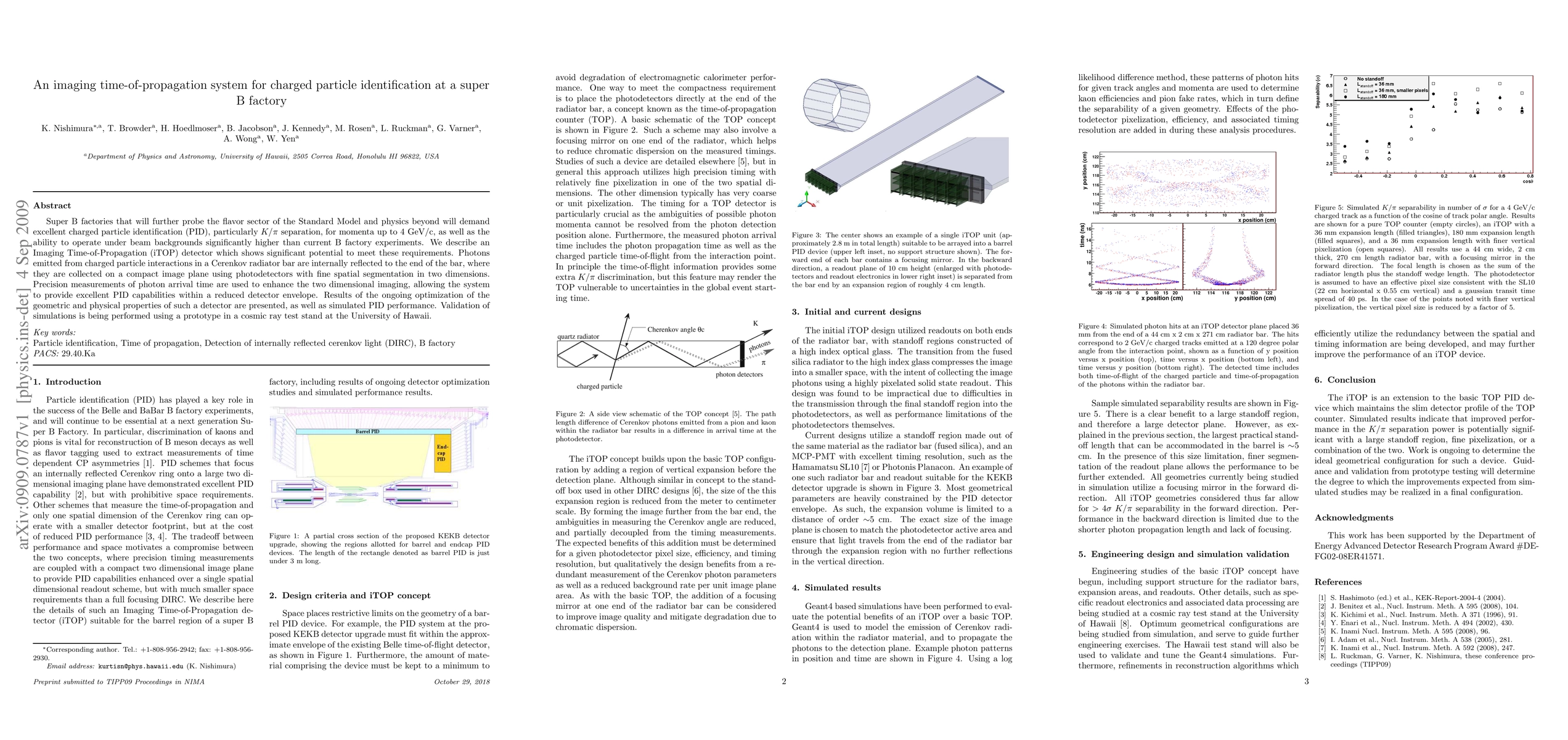 This paper describes an Imaging Time-of-Propagation (iTOP) detector designed for precise charged particle identification at a Super B factory, focusing on K/pi separation up to 4 GeV/c. The iTOP system utilizes Cerenkov photons reflected to photodetectors for time-based imaging, enhancing particle identification within a compact design.