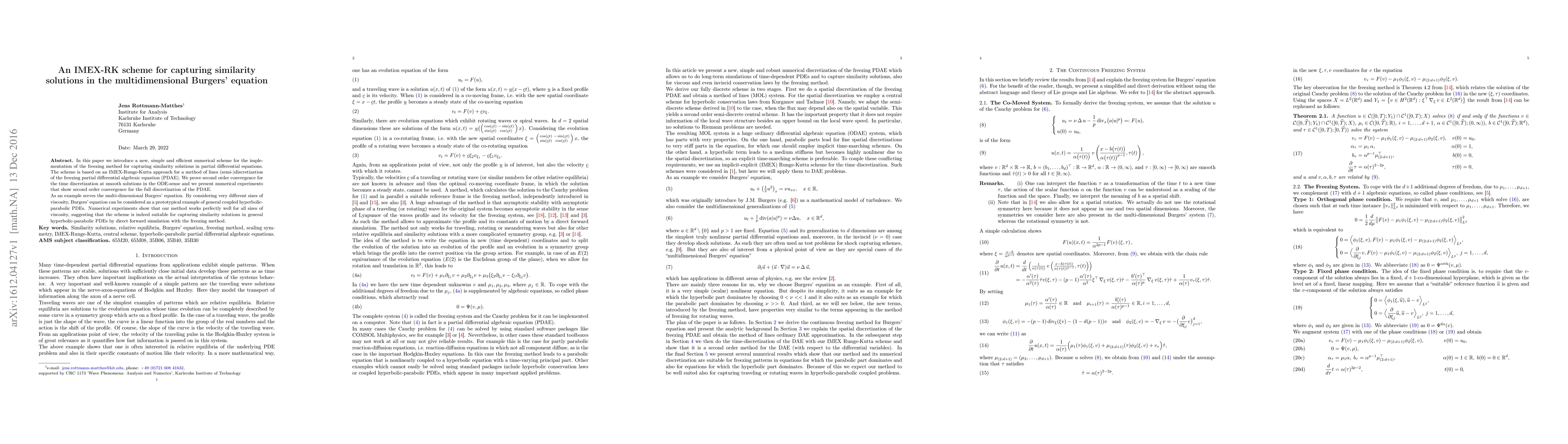 This paper introduces an IMEX-RK scheme for efficiently capturing similarity solutions in the multidimensional Burgers' equation using the freezing method. The proposed method demonstrates second-order convergence and effectively handles a range of viscosities, indicating its suitability for general hyperbolic-parabolic PDEs.