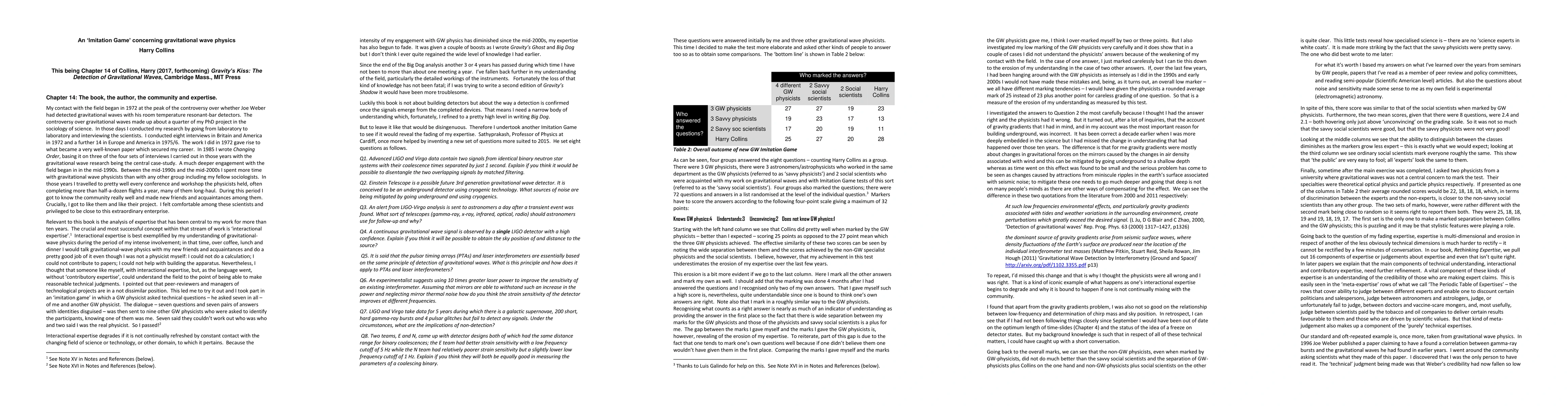 The sociologist Collins, with decades of immersion in gravitational wave physics, successfully passed a more complex Imitation Game compared to other physicists and sociologists, demonstrating sustained expertise relevant to his upcoming book on the topic. His performance and self-marking closely matched that of established gravitational wave physicists.